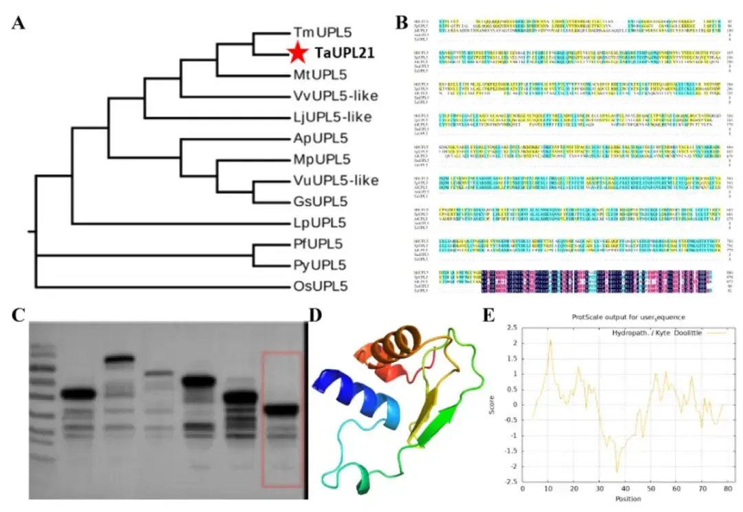 图3. TaUPL21的系统发育、序列比对及结构分析 (A) 使用全长序列构建的TaUPL21最大似然(ML)系统发育树(Bootstrap值为400)。Ap:相思子;Gs:野大豆;Lj:百脉根;Lp:宿根亚麻;Mp:刺毛黧豆;Mt:截形苜蓿;Os:水稻;Pf:紫苏;Py:染井吉野樱;Tm:红三叶;Vu:赤豆;Vv:长柔毛野豌豆。(B) TaUPL21的氨基酸多序列比对。(C) 蛋白表达结果。(D) TaUPL21蛋白的三维结构。(E) 疏水性分析。