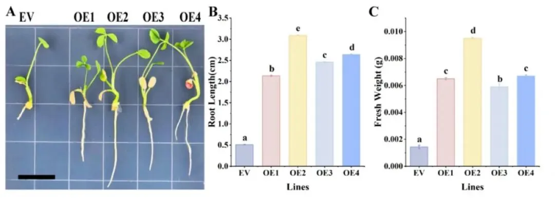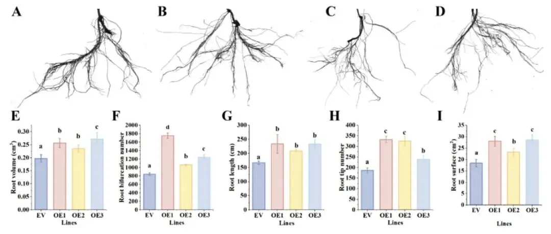 图4. 过表达TaUPL21促进高三叶毛状根发育 (A–D) 高三叶毛状根中过表达TaUPL21的表型。A:空载体(EV);B:OE-1;C:OE-2;D:OE-3。(E) 过表达TaUPL21的根体积。(F) 过表达TaUPL21的根分叉数。(G) 过表达TaUPL21的根长。(H) 过表达TaUPL21的根尖数。(I) 过表达TaUPL21的根表面积。不同小写字母表示同一株系在不同处理时间下的显著差异(p < 0.05)。