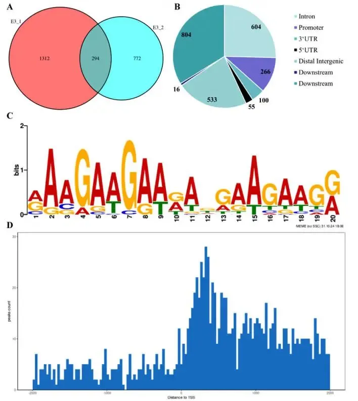 基序鉴定:识别出特异性结合基序,并明确了其在转录起始和终止位点附近的分布模式。