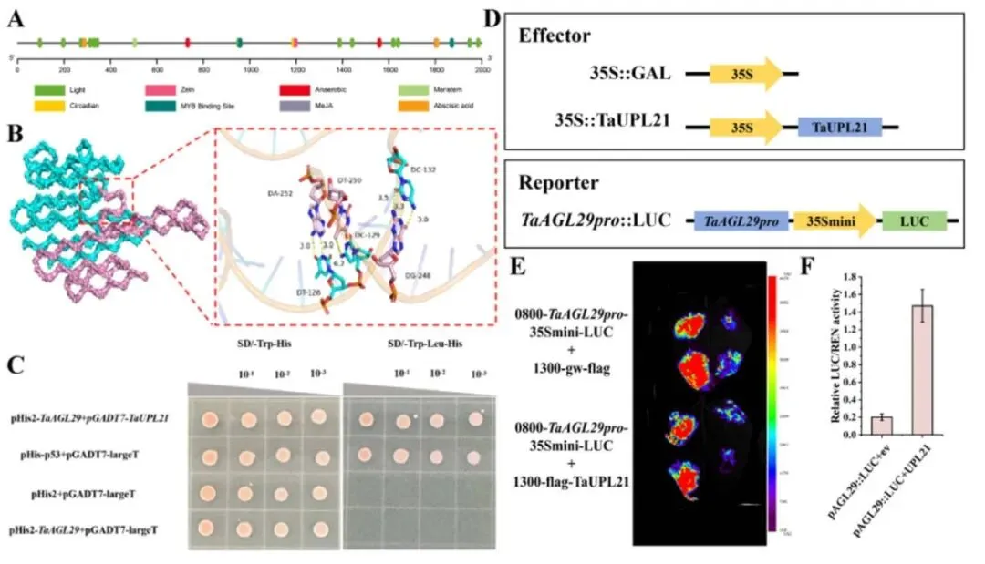互作预测:分子对接预测显示TaUPL21关键残基与TaAGL29启动子形成特异性氢键。
