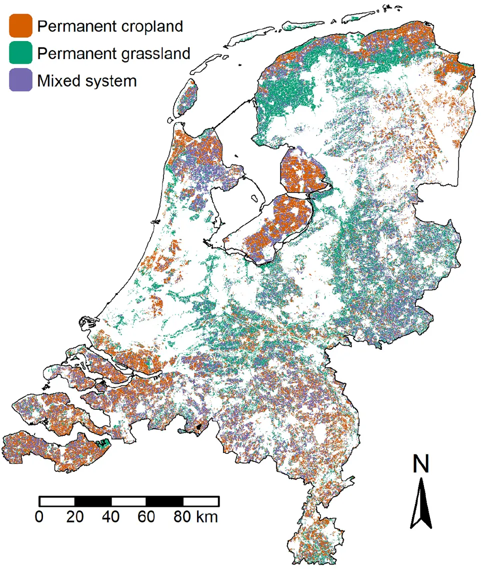 图1.由1986-2022年期间矿物土壤上的三种农用土地利用制度划定。
