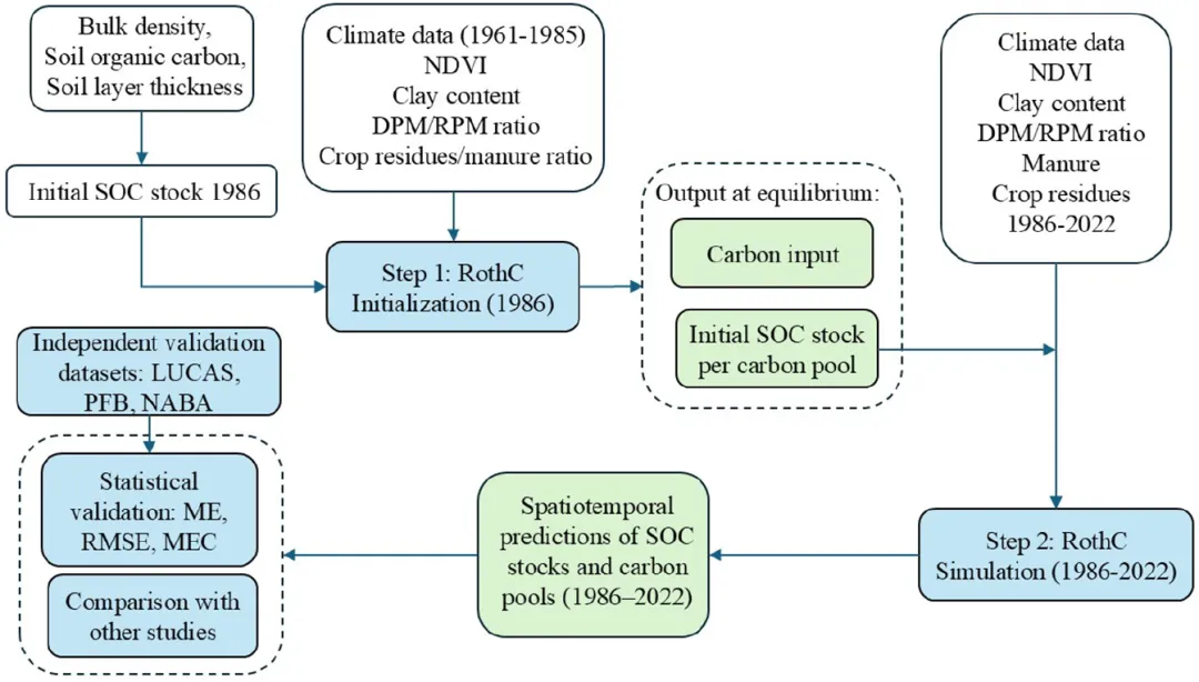 图 2.用于SOC库存时空建模的RothC流程图。白框表示输入数据和参数,蓝框表示模型流程和绩效评估,绿色框表示模型输出。