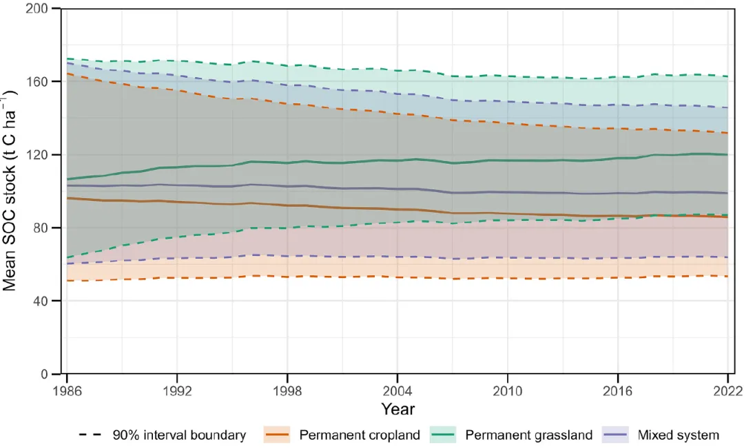 图6.1986年至2022年不同土地利用类型的年平均有机碳储量(t C ha−1)及其第5和第95个百分位数的时间趋势。