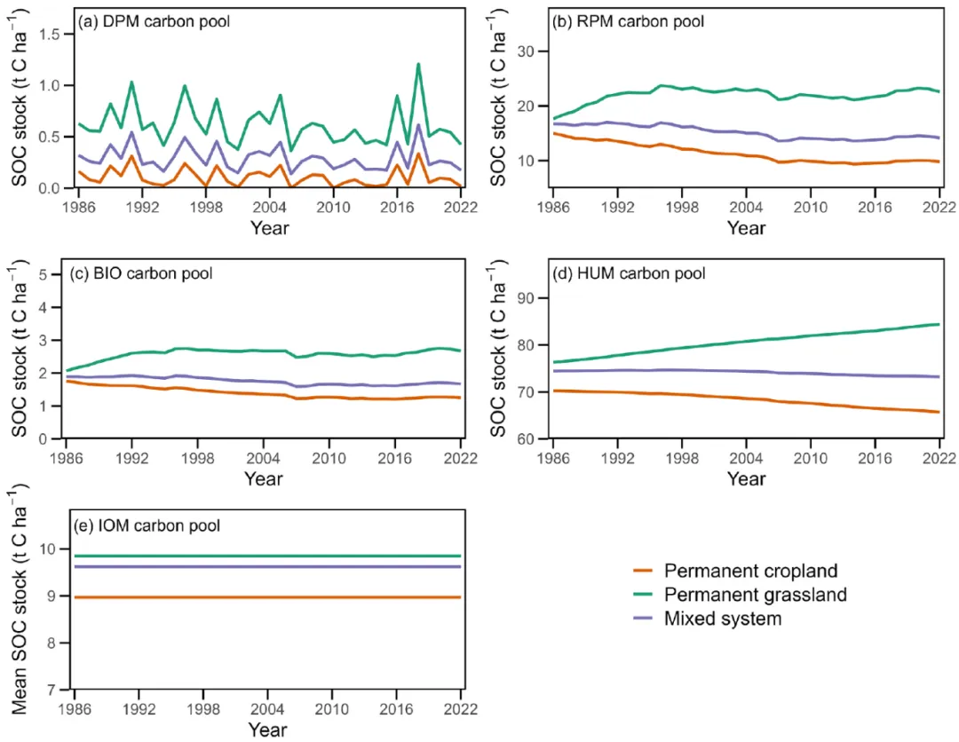 图7.不同土地利用类型下平均RothC碳库的时间趋势:(A)可分解植物材料(DPM),(B)抗性植物材料(RPM),(C)微生物生物量(BIO),(D)腐殖化有机质(HUM),(E)惰性有机质(IOM)。