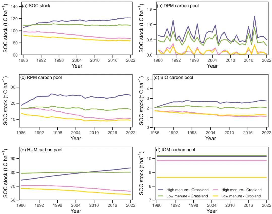 土壤是陆地最大的碳库,土壤有机碳(SOC)在维持土壤质量和相关生态系统服务方面发挥着关键作用。在大范围内以高空间和时间分辨率准确估算 SOC 库储量仍具挑战性,尤其是在农业系统中,碳输入往往不确定或不可用。本研究使用RothC 模型模拟了1986年至2022年荷兰农业矿质土壤中SOC库储量,空间分辨率为25米×25米,研究了总SOC库储量及其在RothC 碳库中的分布随时间和空间的变化,并揭示了牲畜粪便输入和土地利用如何影响观察到的趋势。在表层土壤(0 ~ 30 厘米)中,SOC 库储量在草地增加了 13.2%,在农田减少了10.4%,在土地利用变化的地区减少了 3.9%。草地中碳的增加与系统性较高的粪便输入以及在稳定碳库中的积累有关,而较低的粪便输入和更集约化的管理导致了易变 SOC 库储量的下降。对三个空间数据集进行的独立验证表明,基于点的田间数据模型性能最高(1986年模型效率系数MEC 为0.32,2022年为0.37)。在所有数据集中,随时间推移观测到的土壤有机碳(SOC)变化情况可能无法很好地重现(MEC ≈ 0),但模拟的时空模式与先前的观测研究结果一致。该研究展示了RothC在全国范围内评估和监测SOC库存方面的潜力,同时也强调了改进输入数据和时间验证数据的必要性。这种建模方法有效地捕捉了 SOC 库存动态,这对于纯经验统计模型来说仍是一个挑战。未来的研究可以从将 RothC 与机器学习相结合的混合建模方法中获益,从而增强捕捉当前未解释的变异性并提高模拟性能的能力。
