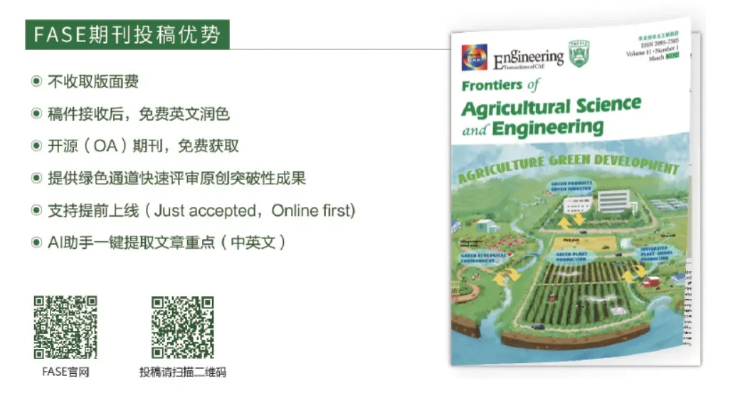 Frontiers of Agricultural Science and Engineering, 简称FASE,2014年2月创刊,是由中国工程院、中国农业大学和高等教育出版社联合主办的国际化英文期刊。目前已被DOAJ、Scopus、ESCI、EBSCO、CSCD、CAS、AGRIS、CABI等数据库收录,2024年影响因子2.8,五年影响因子3.5,JCR Q1区。2024年CiteScore为5.6,列General Veterinary领域4%。FASE旨在为农业科学与工程领域的研究人员提供论文发表与学术交流的国际化平台,内容涵盖农业科学、农业技术/工程、农业经济、农业政策及管理等可促进当前与未来农业可持续发展的学科。