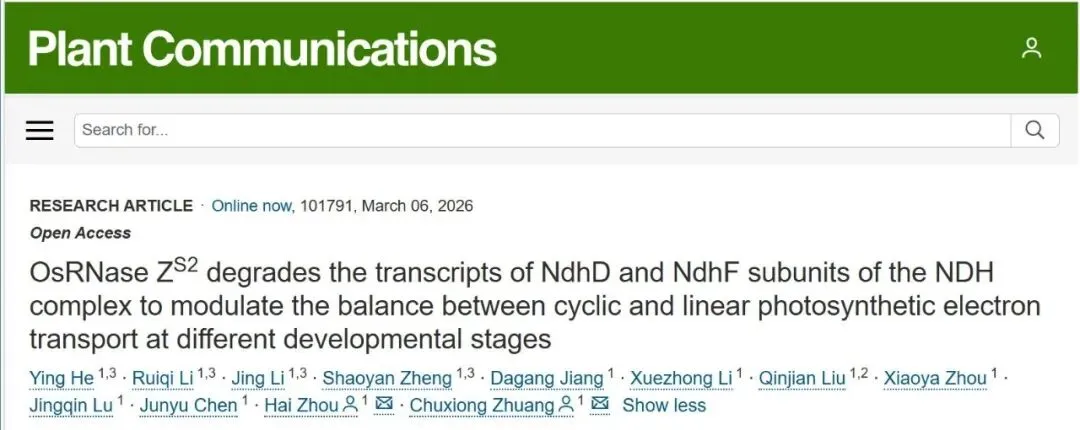 He, Y., Li, R., Li, J., Zheng, S., Jiang, D., Li, X., Liu, Q., Zhou, X., Lu, J., Chen, J., Zhou, H., Zhuang, C., OsRNase ZS2 degradesthe transcripts of NdhD and NdhF subunits of the NDH complex to modulate the balance between cyclic and linear photosynthetic electron transport at different developmental stages, Plant Communications (2026), doi: https://doi.org/10.1016/j.xplc.2026.101791.