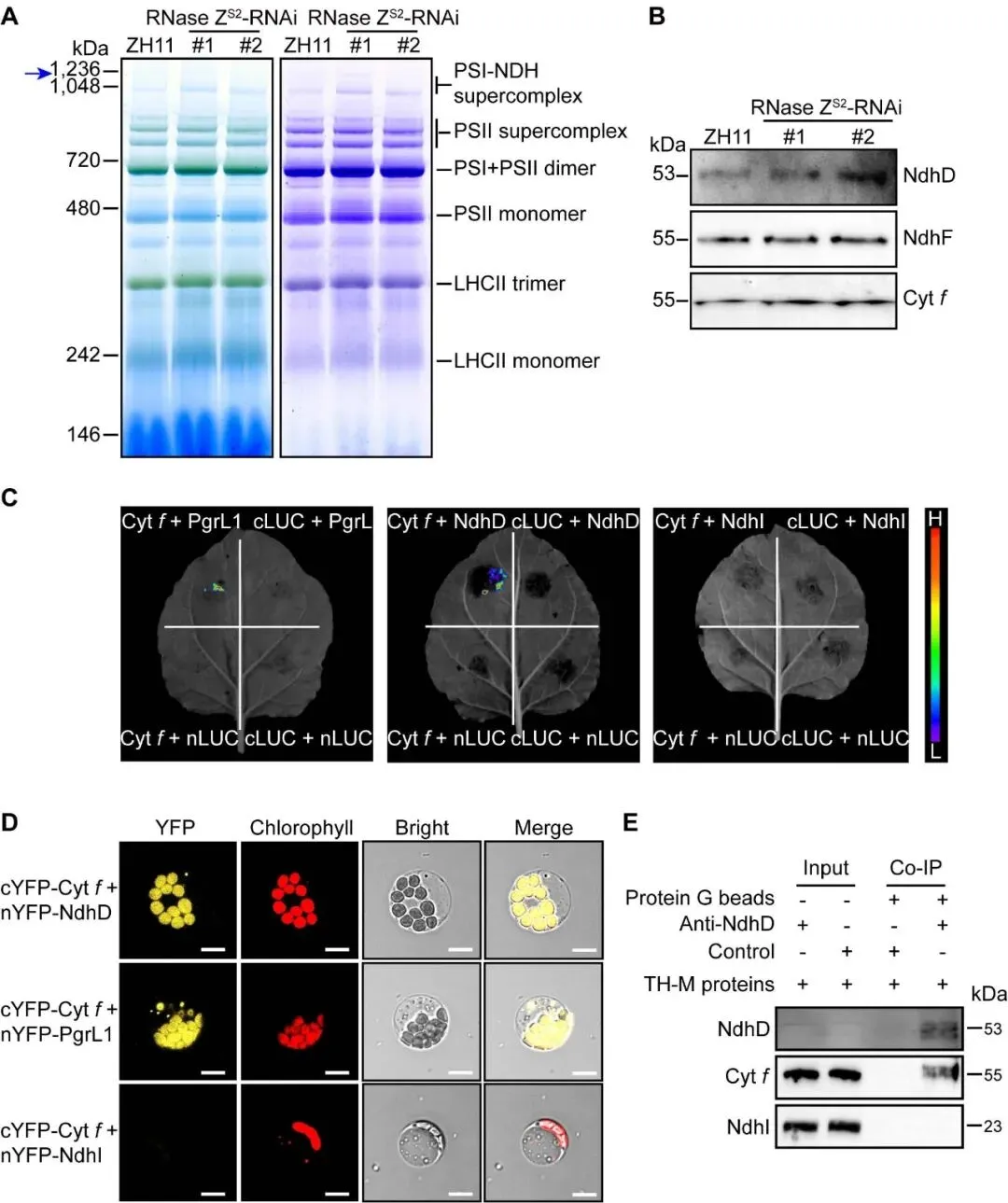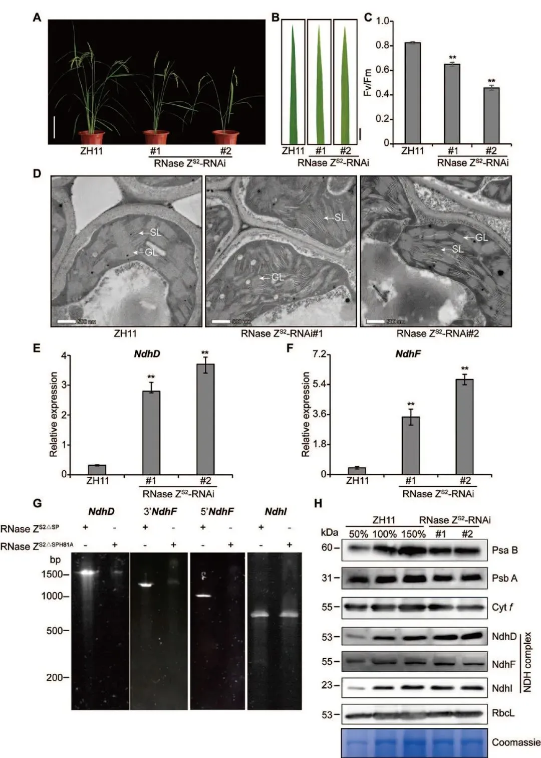 图1.验证OsRNase ZS2可降解 NdhD和NdhF转录本,展示了RNAi植株开花期表型、叶绿体超微结构、NdhD和NdhF的表达及蛋白水平、体外酶切实验结果等。