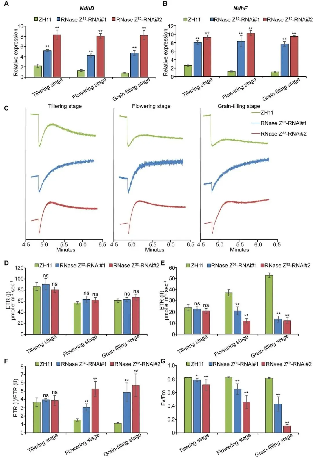 研究还发现,水稻不同发育阶段对环式电子传递与线性电子传递比例的需求存在差异。在野生型水稻中,分蘖期OsRNase ZS2表达较低,NdhD和NdhF表达较高,环式电子传递比例较高;而抽穗期和灌浆期OsRNase ZS2表达升高,NdhD和NdhF表达降低,环式电子传递比例下降,线性电子传递比例升高。相比之下,OsRNase ZS2 -RNAi植株在各发育阶段均维持较高的环式电子传递比例,导致抽穗期和灌浆期PSII最大光化学效率Fv/Fm下降21-39%,叶片出现黄化现象。
