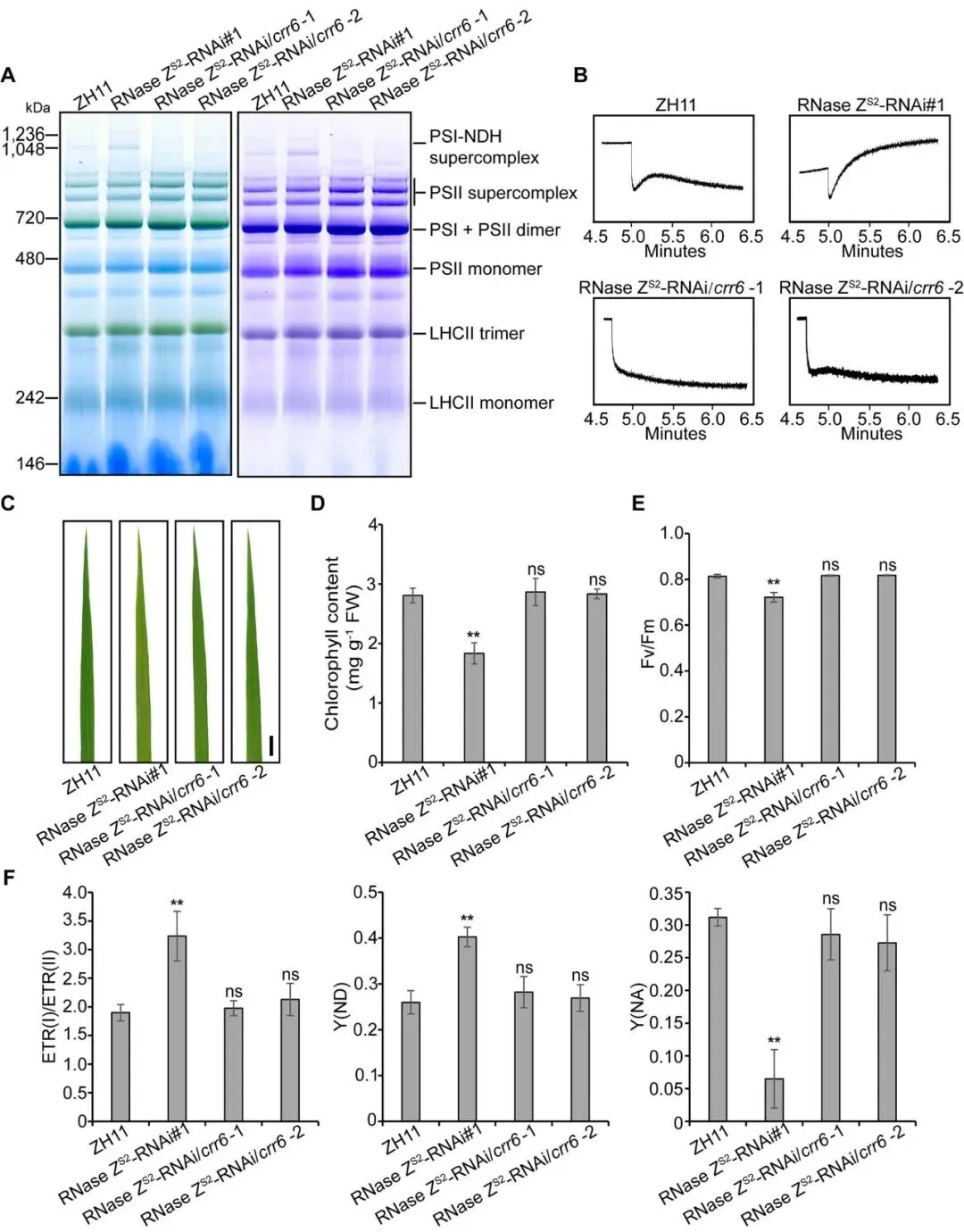 通过在水稻OsRNase ZS2-RNAi背景中敲除NDH复合体组装因子CRR6,NDH-PSI超级复合体消失,NDH活性丧失,叶片黄化表型得以恢复,光合参数恢复至野生型水平,证实了OsRNase ZS2通过调控NDH复合体进而影响环式电子传递与线性电子传递比例的分子机制。