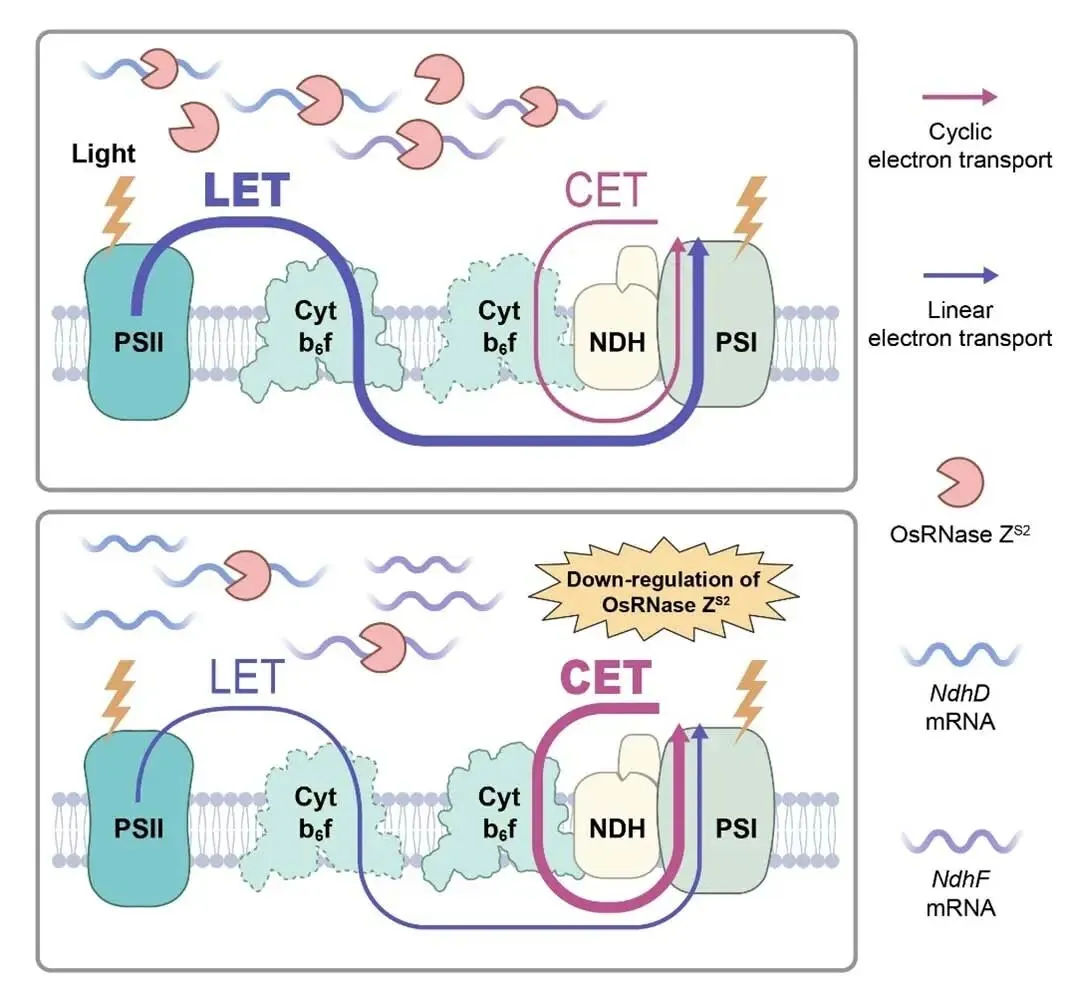 图6.为该研究提出的OsRNase ZS2调控光合电子传递平衡的分子模型,展示了OsRNase ZS2通过降解NdhD和NdhF mRNA调控NDH复合体活性,进而通过与Cyt b6f复合体相互作用调控 CET/LET 比例的分子过程。