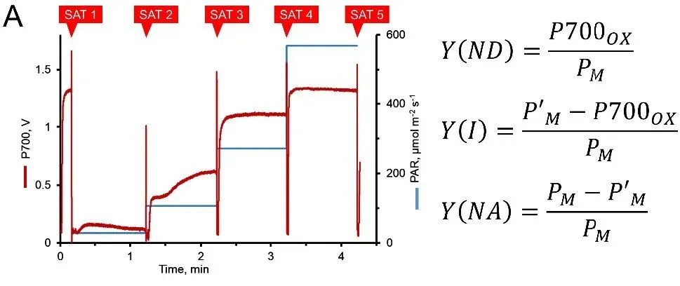 工程师笔记 本研究中,采用实验室版DUAL-PAM-100双通道叶绿素荧光仪(Heinz Walz)同步测定叶绿素a荧光及光系统I反应中心P700的氧化还原状态。测定前,将植株暗处理30分钟。采用波长620 nm、光子通量密度为0.05~0.1μmolm-2s-1的弱测量光激发,获得植株暗适应状态下的最小荧光值(Fo);施加饱和光脉冲(脉冲时长300ms,光子通量密度 10000 μmolm-2s-1),测定暗适应状态下及光化光照射过程中的最大荧光值(分别为Fm和Fm′)。在光化光照射(光子通量密度300~1500μmolm-2s-1)、叶片温度25℃、环境二氧化碳分压40 Pa的条件下,记录稳态荧光值(Fs)。光系统II的最大光量子产额按Fv/Fm计算,非光化学淬灭系数按(Fm−Fm′)/Fm′计算;光系统II的实际光量子产额Y(II)按(Fm–Fs)/Fm′计算。用于评估PQ库氧化还原水平的参数qL,按公式(Fm′–Fs)/(Fm′-Fo′)×(Fo′/Fs)计算。 点击图片了解更多信息 通过监测830 nm和870 nm波长下的反射光强度,分析P700的氧化还原变化。在720 nm远红光照射条件下施加饱和光脉冲,测定暗环境中P700的最大氧化水平(Pm);在光化光照射过程中施加饱和光脉冲,测定P700的最大氧化水平(Pm′)。在饱和光脉冲施加前,记录P700的信号值(P)。光系统I的实际光量子产额Y(I)按(Pm′–P)/Pm计算;光系统I受体侧限制系数Y(NA)按(Pm–Pm′)/Pm计算;光系统I供体侧限制系数Y(ND)按P/Pm计算。上述三个光量子产额为互补关系,满足Y(I)+Y(NA)+Y(ND)=1。