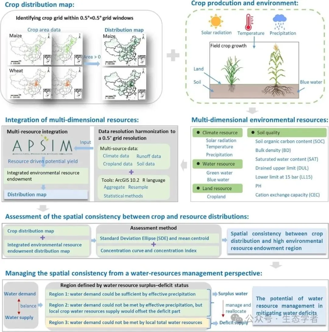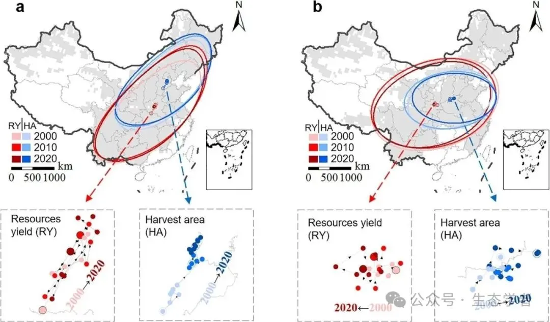 中国以全球7%的耕地养活了22%的人口,资源环境压力巨大。气候变化导致的温度升高和降水模式改变,驱使农户通过调整种植区域(作物迁移)来规避风险。前人研究多从气候的角度关注种植分布的适应性,但忽略了“环境资源禀赋”是一个多维度的整体(包括光、温、水、土等)。如果作物盲目向气候适宜但其它资源匮乏的地区迁移,将导致地下水超采和生态环境恶化等问题。因此,定量评估作物分布与综合环境资源禀赋的空间一致性,是实现农业可持续发展的关键。为此,论文通过建立多维度环境资源禀赋的综合评价框架,将作物模型模拟的“气候资源驱动潜力(CRY)”和“气象-水资源驱动潜力(RY)”作为衡量区域综合环境资源禀赋的指标;利用标准差椭圆(SDE)和重心迁移分析,对比了过去20年作物实际种植面积(HA)与环境资源禀赋重心的移动轨迹;引入经济学中的洛伦兹曲线(Lorenz curves)和基尼系数(Gini coefficients),量化环境资源禀赋分布与种植布局的匹配程度。