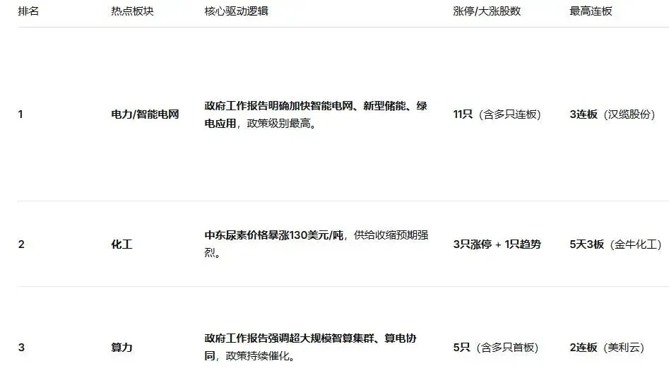 结论:电力/智能电网板块成为今日最强主线,涨停数量最多、梯队最完整、政策级别最高;化工涨价逻辑强劲但个股较少;算力虽有政策但涨停股相对分散。