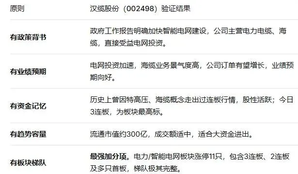 龙头地位确认:汉缆股份(002498) 是当前市场最强主线(电力/智能电网)的连板龙头,3连板引领板块,梯队完整,资金介入明确,具备持续走强潜力。
