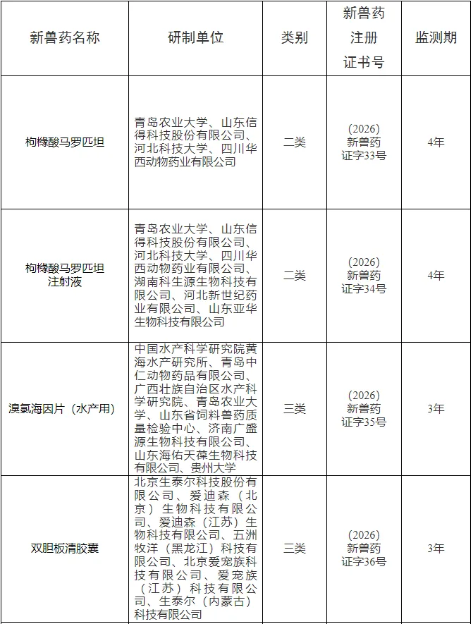 根据《兽药管理条例》和《兽药注册办法》规定,经审查,批准枸橼酸马罗匹坦等7种兽药产品为新兽药,核发《新兽药注册证书》,发布产品质量标准、工艺规程、说明书和标签,自发布之日起执行。