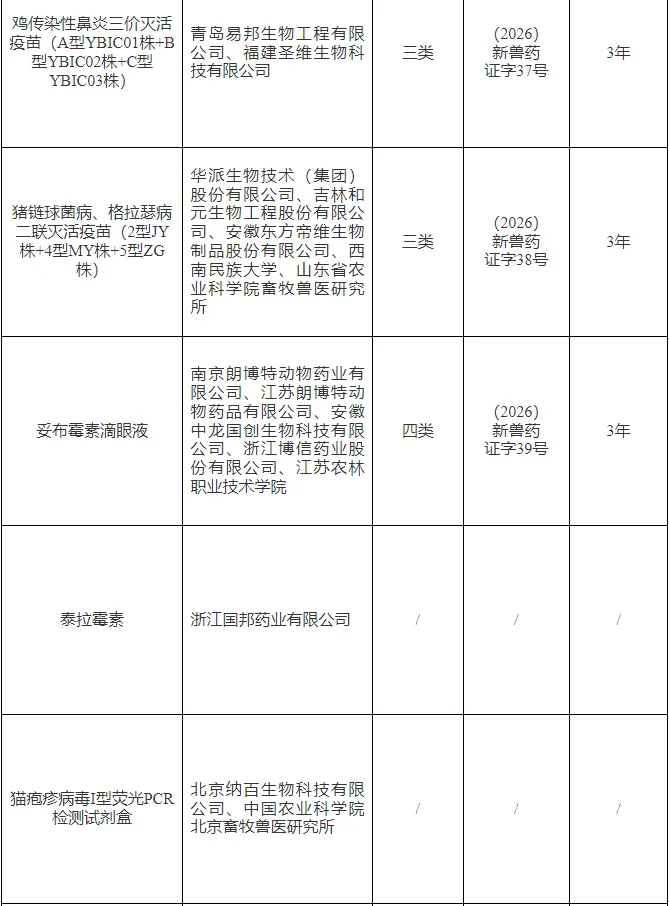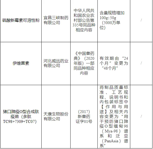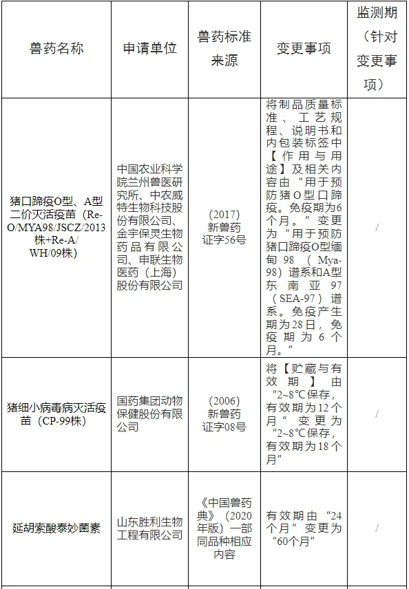 批准猪口蹄疫O型、A型二价灭活疫苗(Re-O/MYA98/JSCZ/2013株+Re-A/WH/09株)等6种兽药产品变更注册,有关单位按照农业农村部批准的变更事项,自行修改原批准的说明书和标签对应内容,并印制、使用。