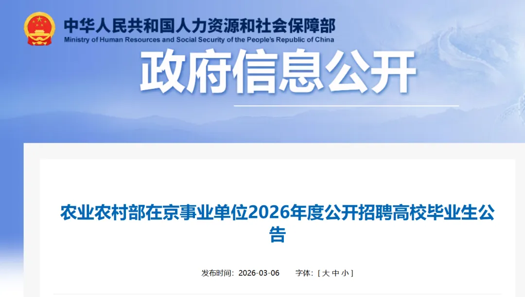 根据工作需要,按照事业单位公开招聘有关政策规定,开展农业农村部在京事业单位2026年度公开招聘高校毕业生工作。现将有关事项公告如下: