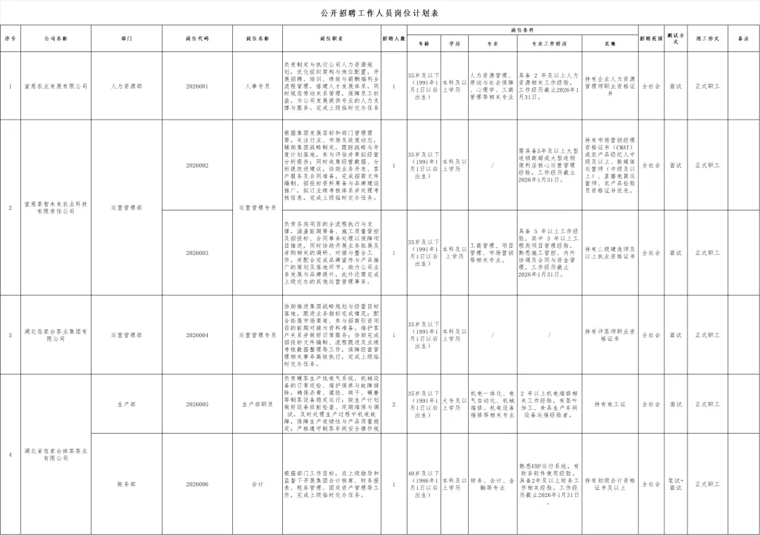 宣恩农业发展有限公司(以下简称“农发公司”)成立于2025年,为县属国有1级A类企业。为进一步深化国有企业改革,助推县域经济社会高质量发展,根据经营发展及人才队伍建设需要,经研究决定,现面向社会公开招聘工作人员7名。现将相关事宜公告如下: