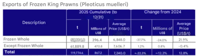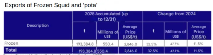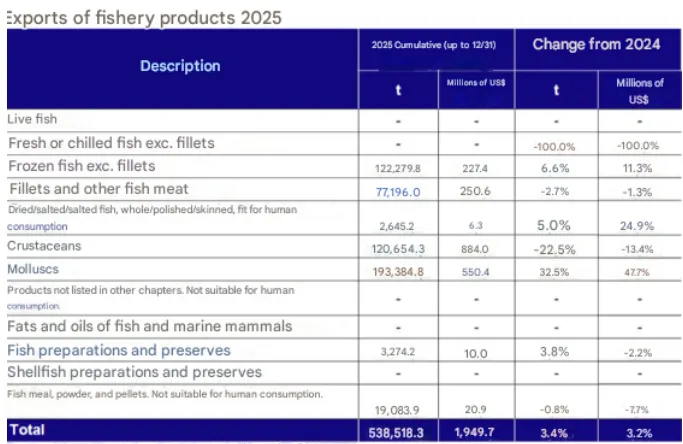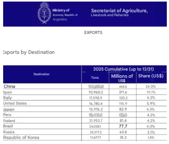1.2025 年阿根廷渔业出口额达20.66 亿美元,同比增长 3.9%,为该国历史第二高水平,仅低于 2018 年的 21.55 亿美元。