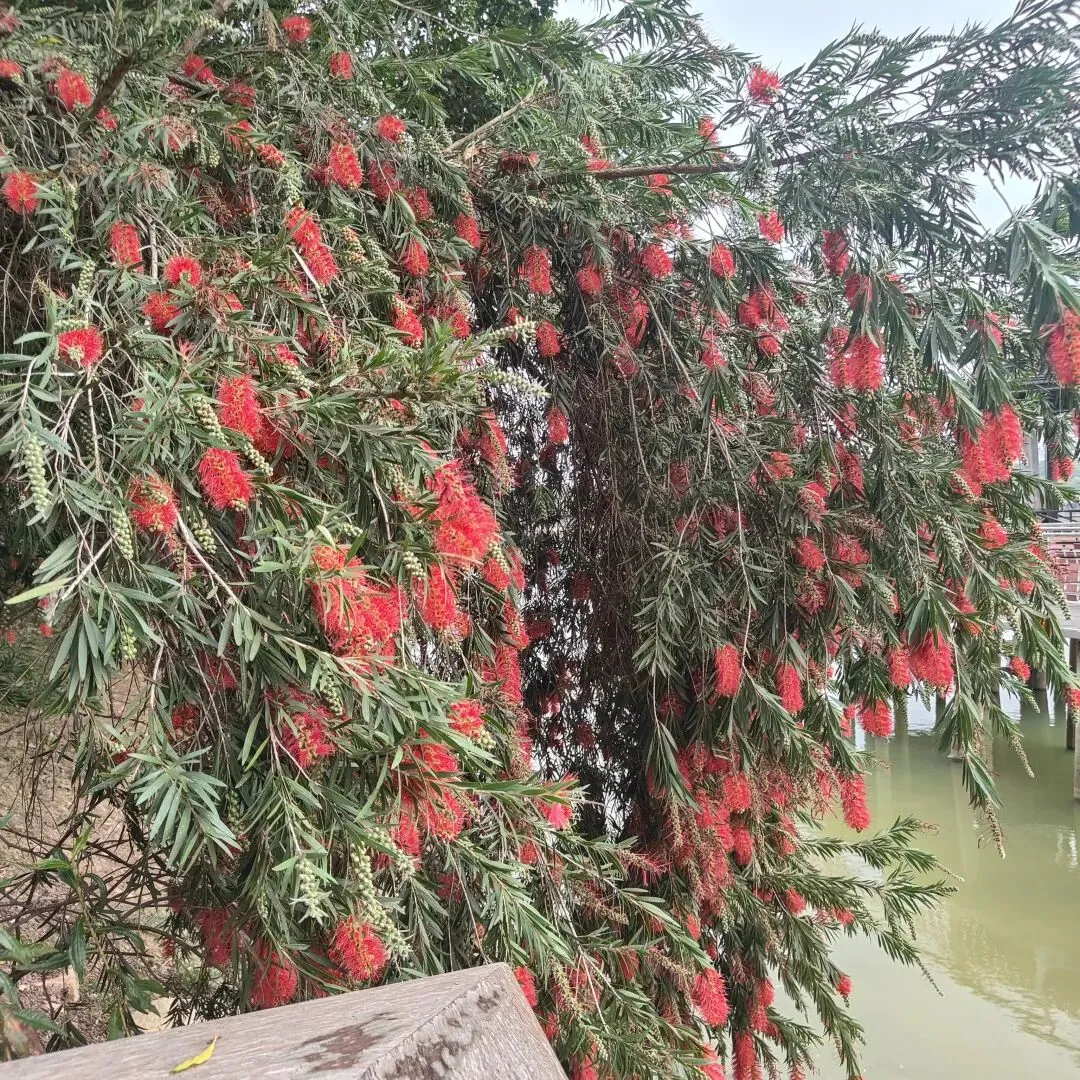 还有开花的红千层,一束束红色的花,像瓶刷一样,满树的艳红,耀眼迷人。