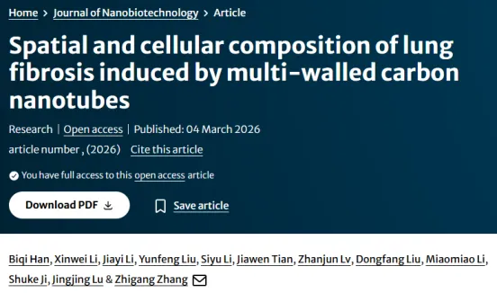 近日,东北农业大学动物医学学院张志刚教授团队在Springer Nature旗下期刊《Journal of Nanobiotechnology》发表研究论文“Spatial and cellular composition of lung fibrosis induced by multi-walled carbon nanotubes”。该刊在中科院期刊分区为生物学一区TOP,影响因子为12.6(即时影响因子14.9)。