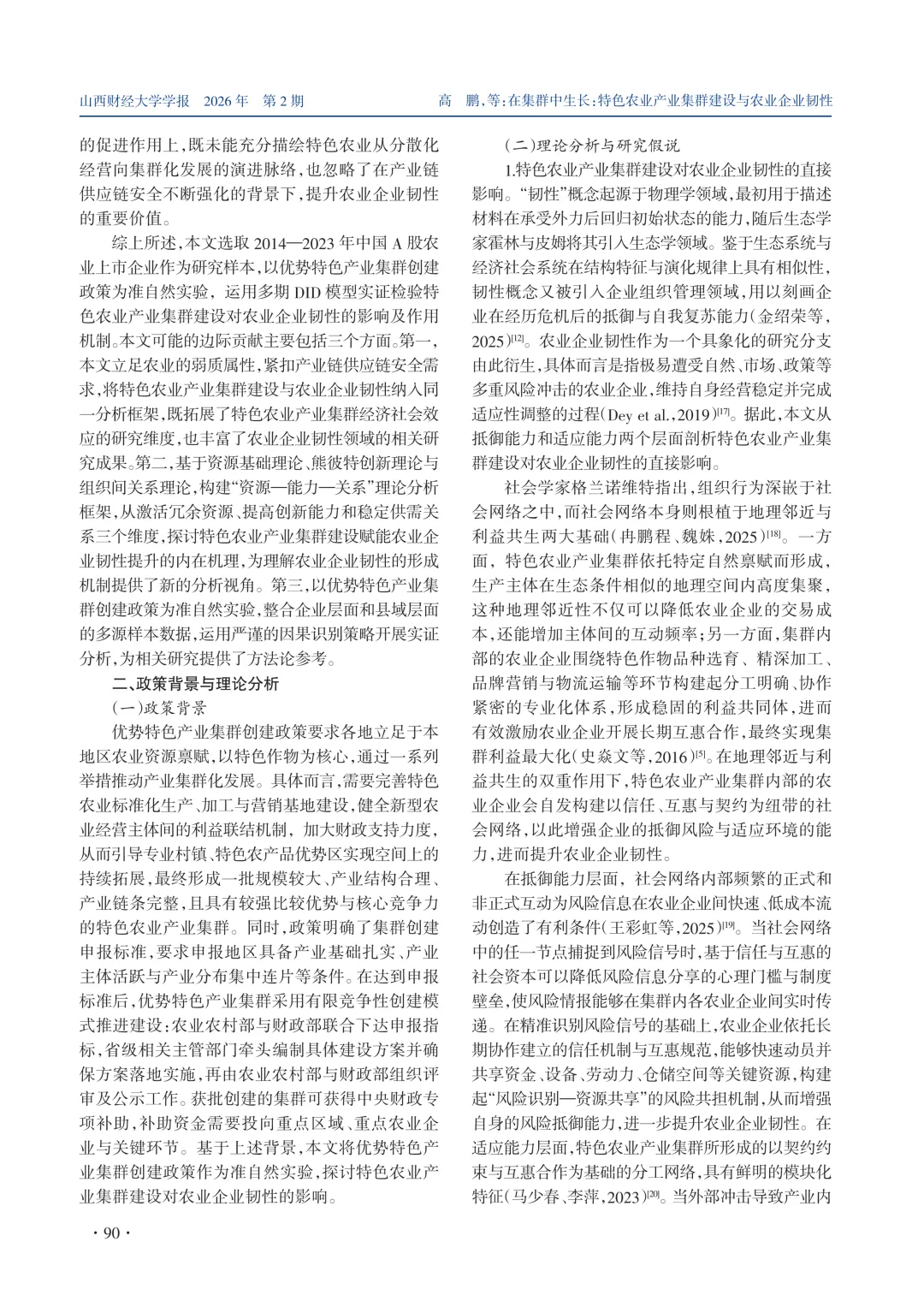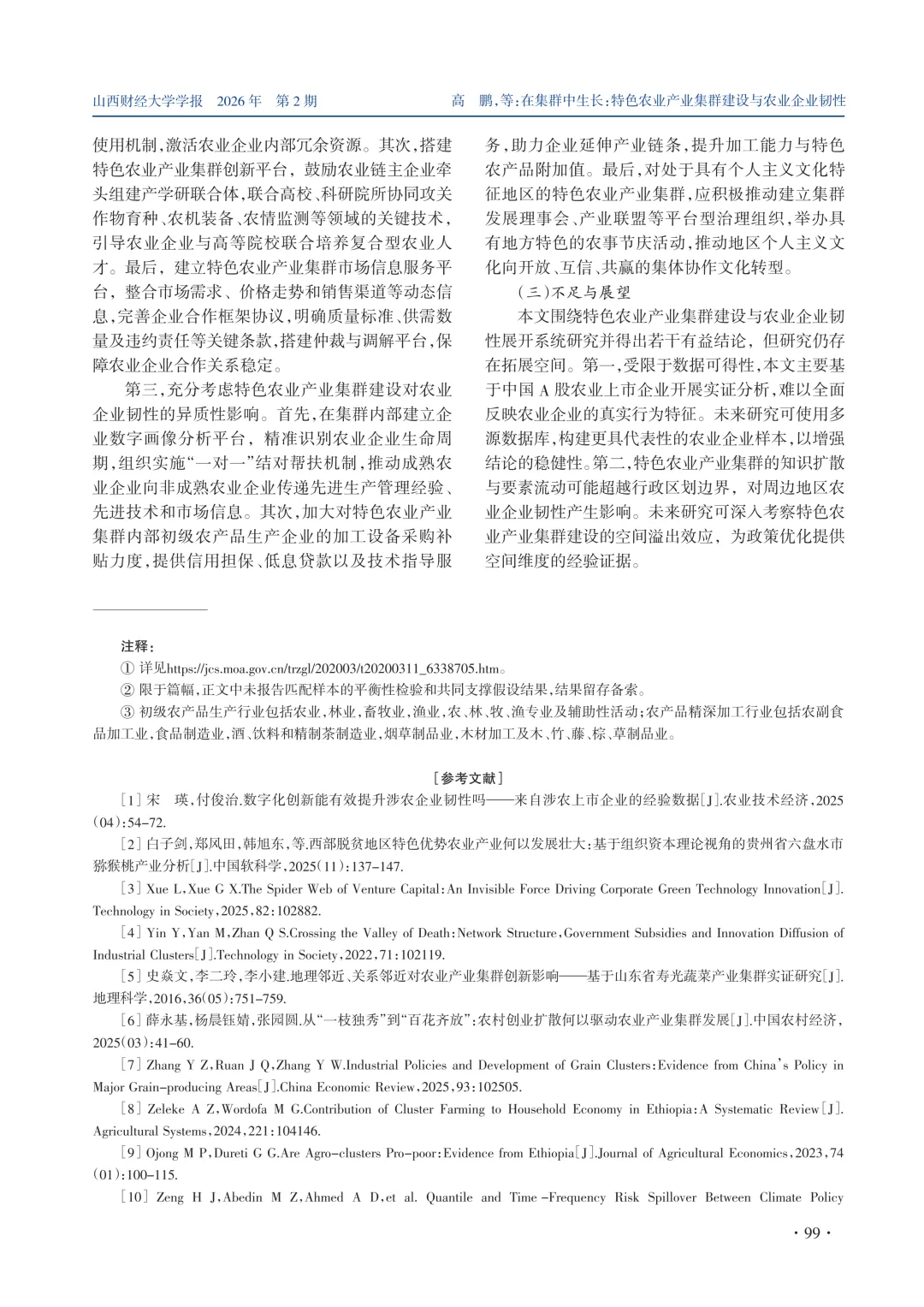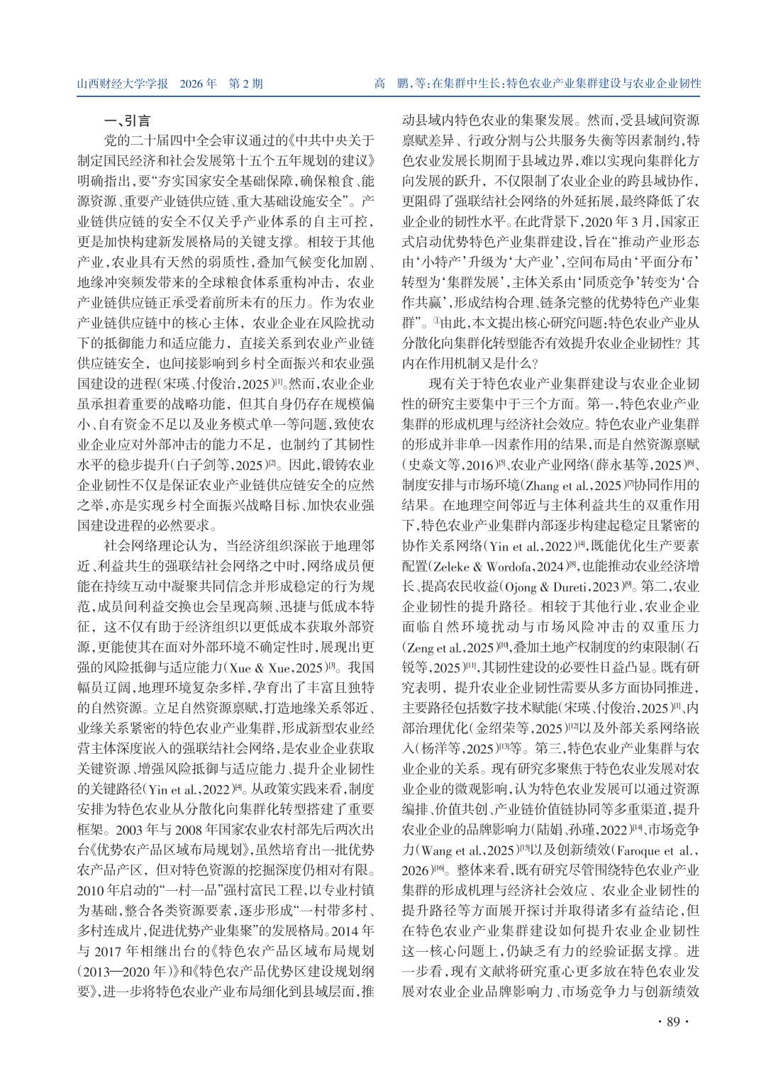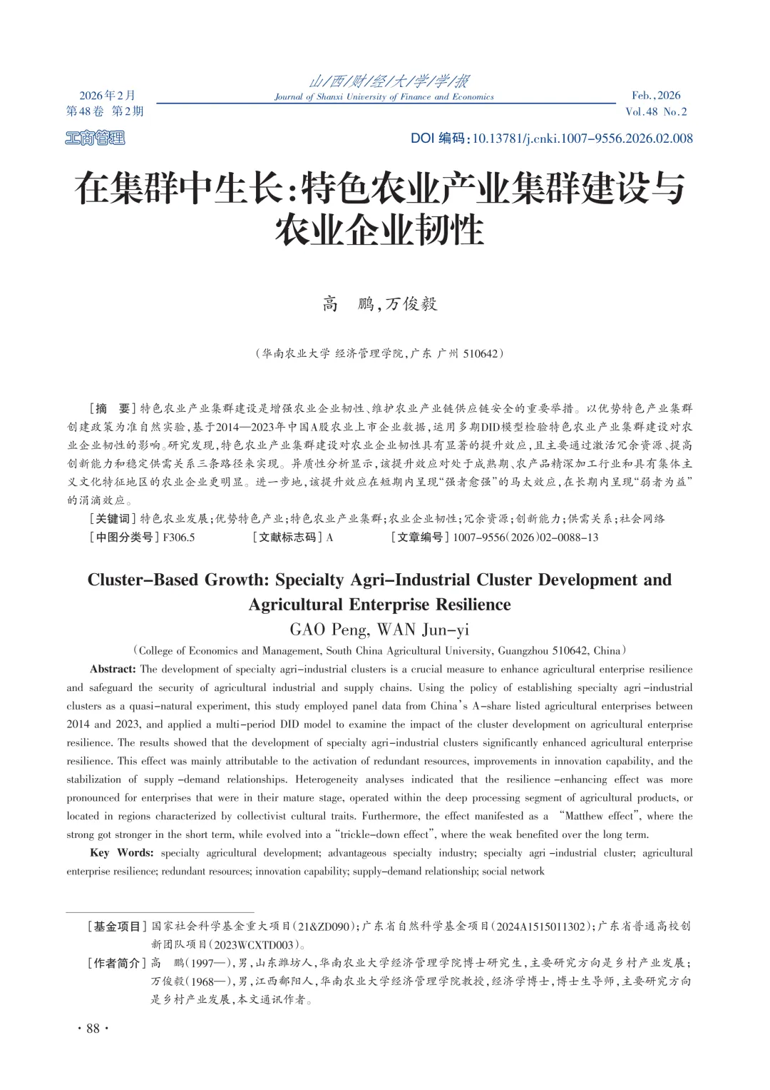 引用格式:高鹏,万俊毅.在集群中生长:特色农业产业集群建设与农业企业韧性[J].山西财经大学学报,2026,48(02):88-100.