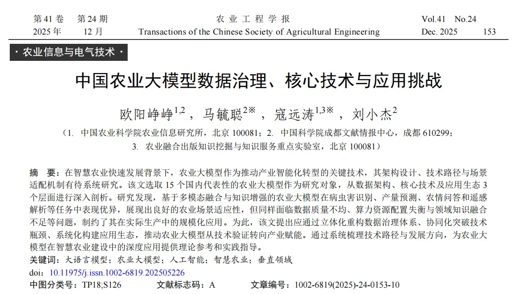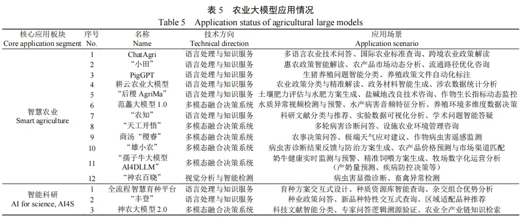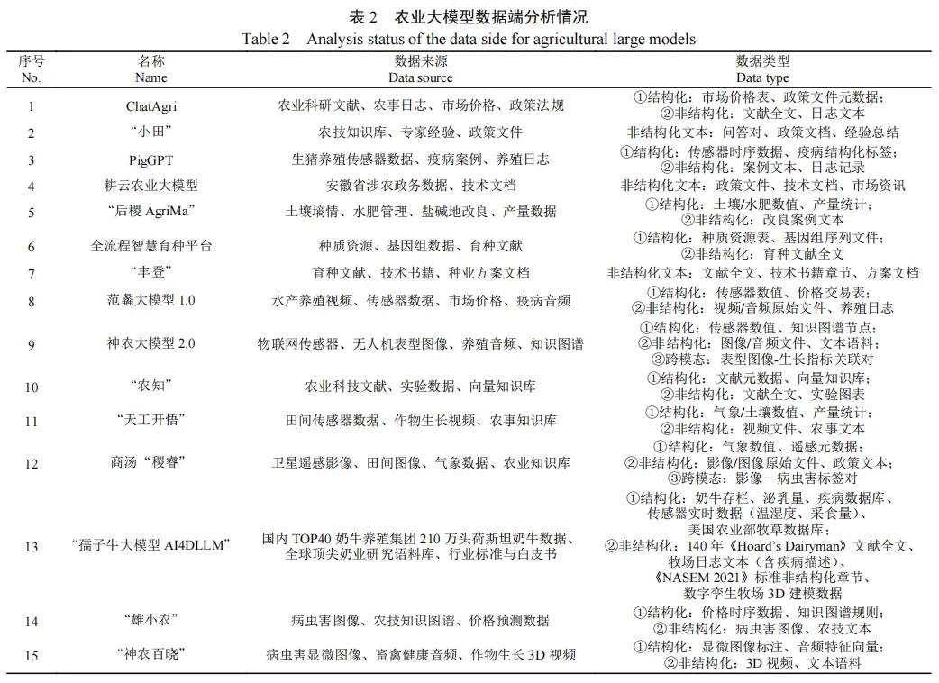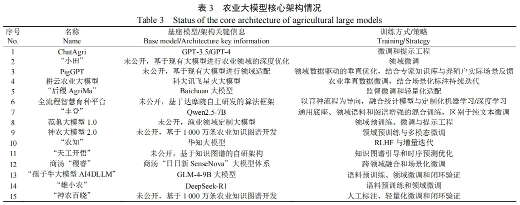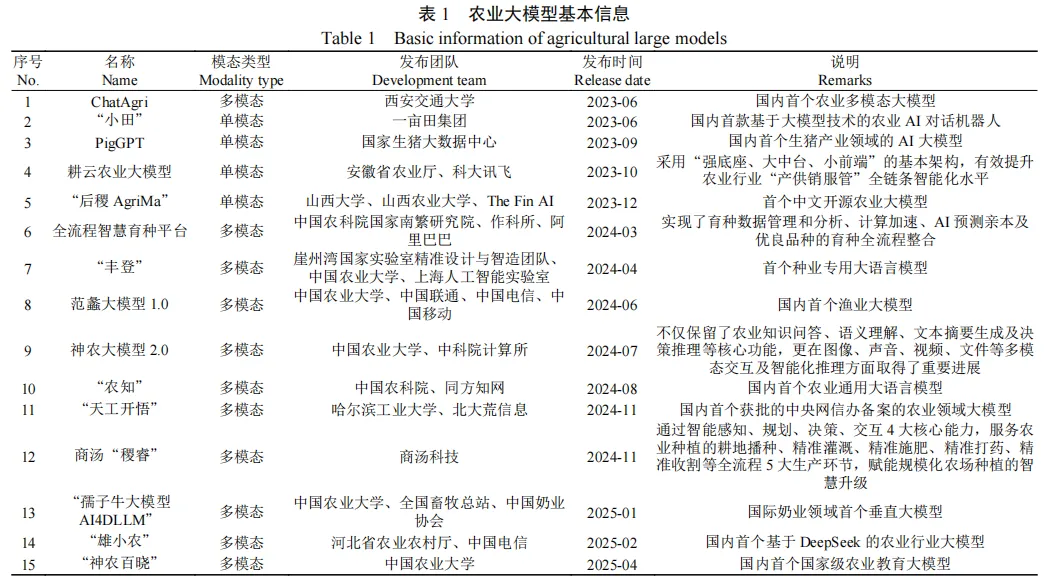 在智慧农业快速发展背景下,农业大模型作为推动产业智能化转型的关键技术,其架构设计、技术路径与场景适配机制有待系统研究。该文选取15个国内代表性的农业大模型作为研究对象,从数据架构、核心技术及应用生态3个层面进行深入剖析。