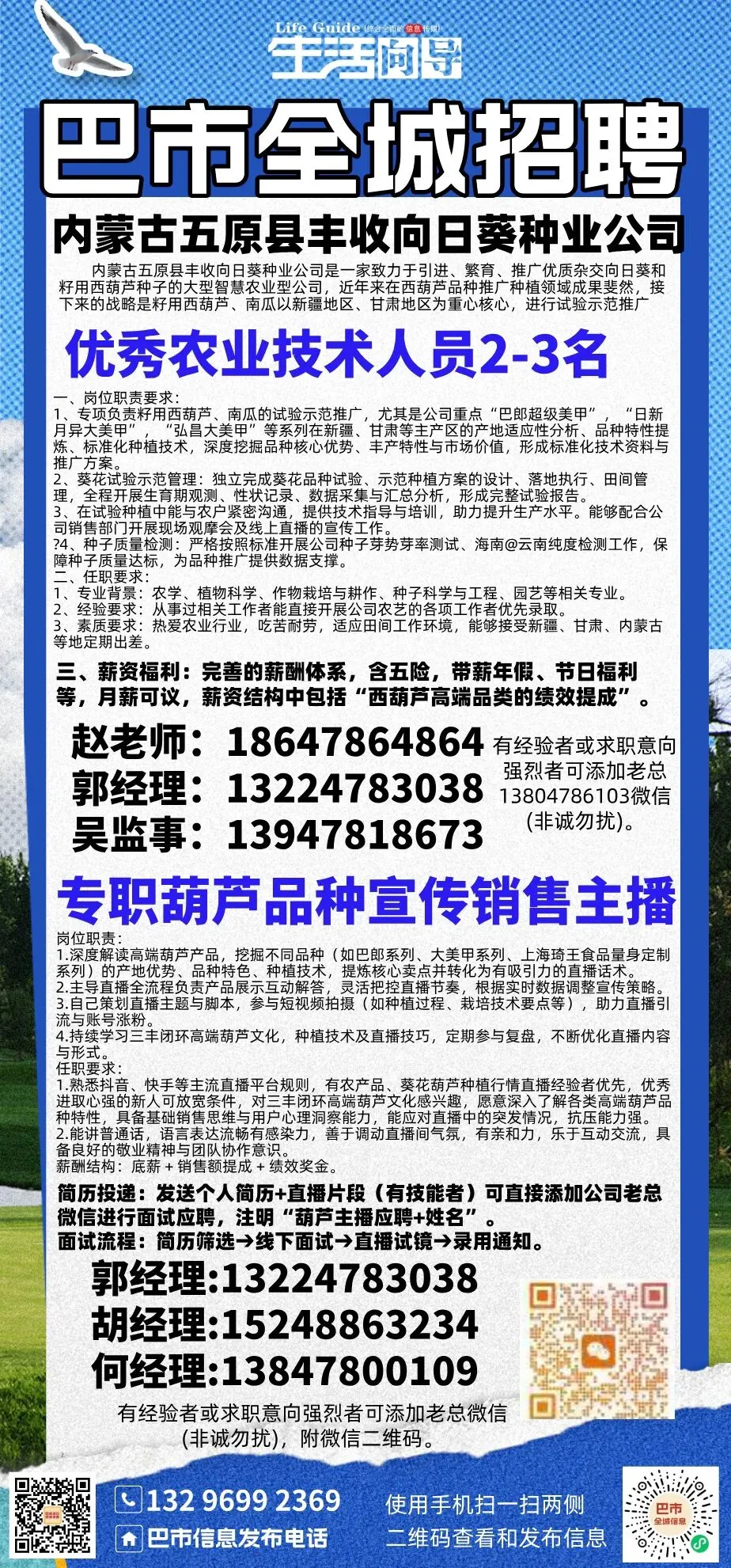 巴市五原企业直招招聘:内蒙古三丰闭环农业发展有限责任公司高薪招聘葫芦品种宣传销售主播和优秀技术人员(含五险有带薪年假)