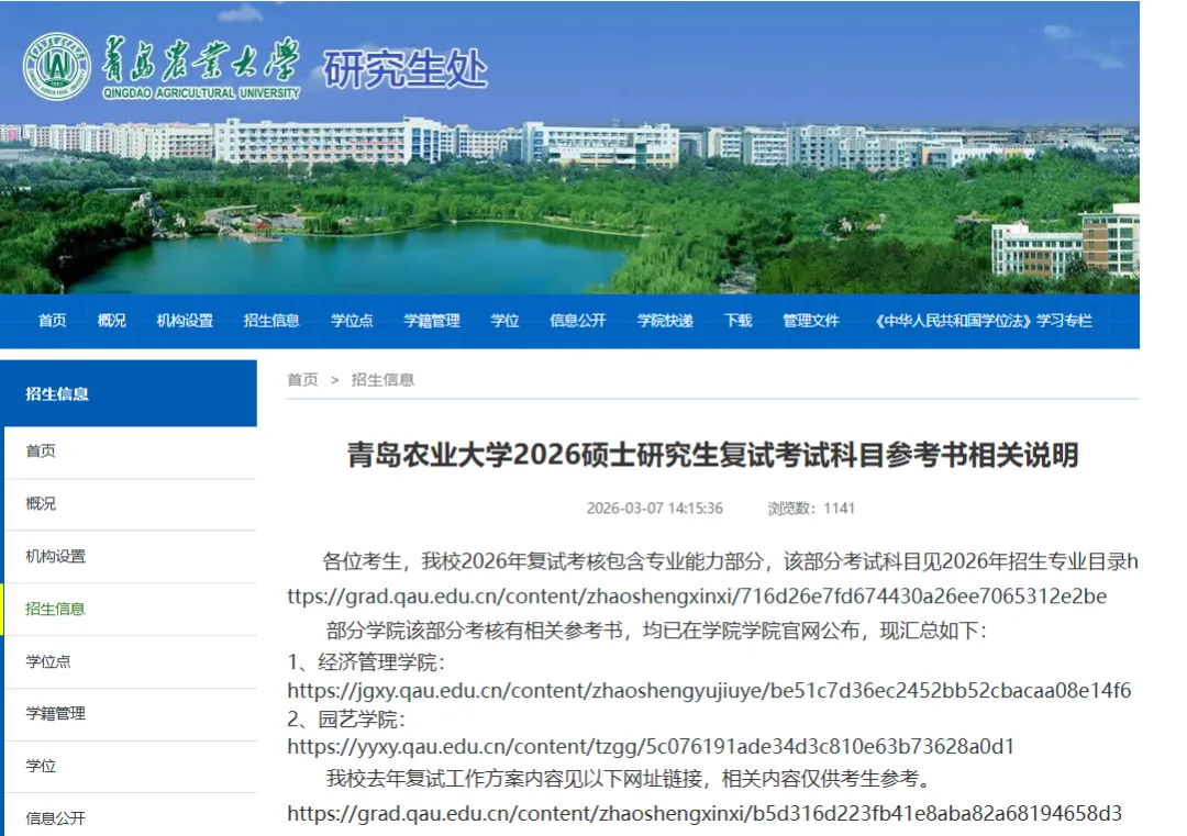 各位考生,我校2026年复试考核包含专业能力部分,该部分考试科目见2026年招生专业目录https://grad.qau.edu.cn/content/zhaoshengxinxi/716d26e7fd674430a26ee7065312e2be
