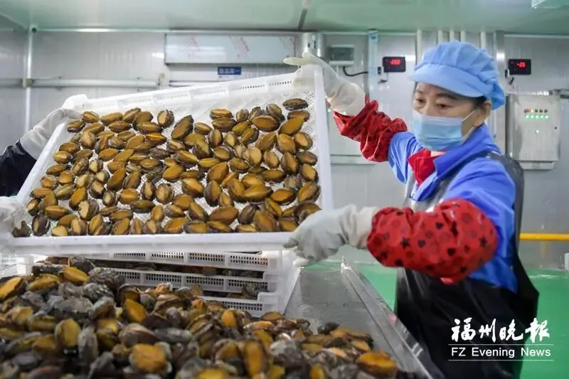 在福建省鸿航水产有限公司加工厂,工人将新鲜鲍鱼进行冷冻处理。