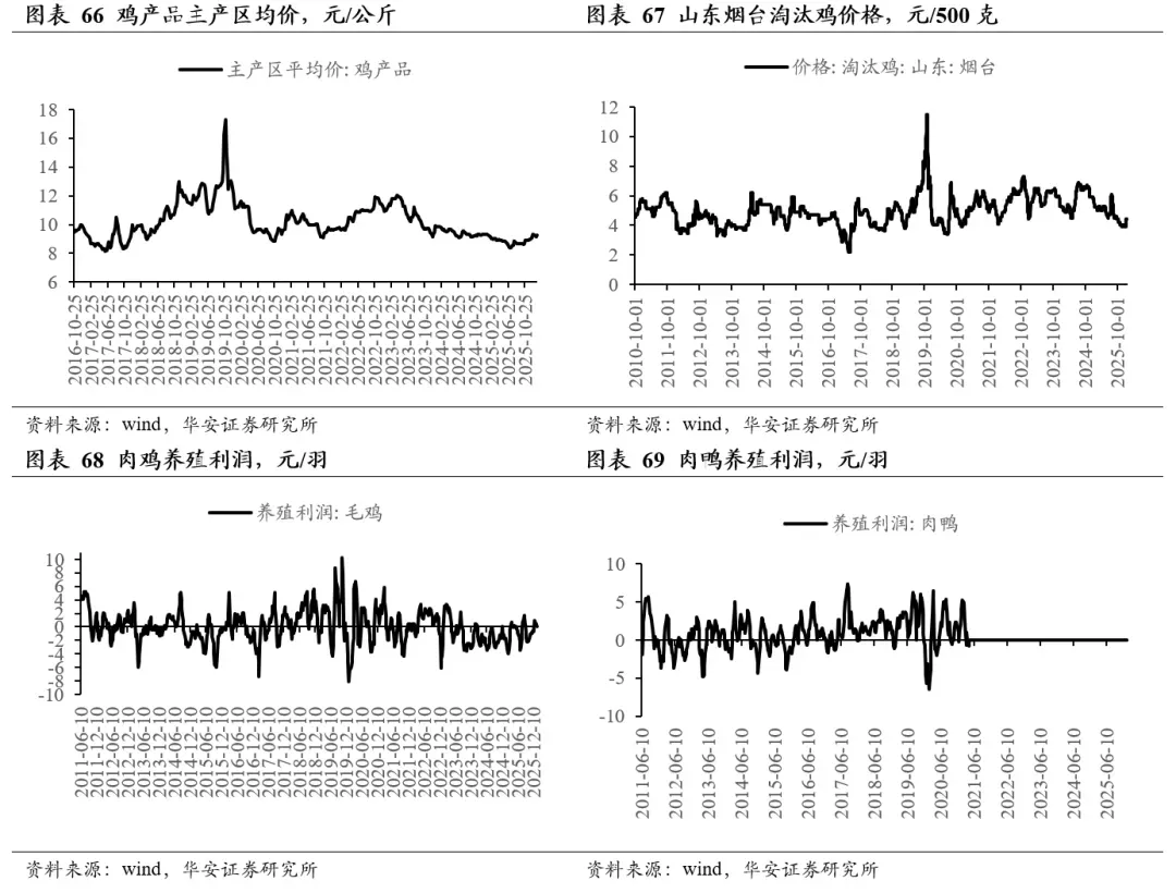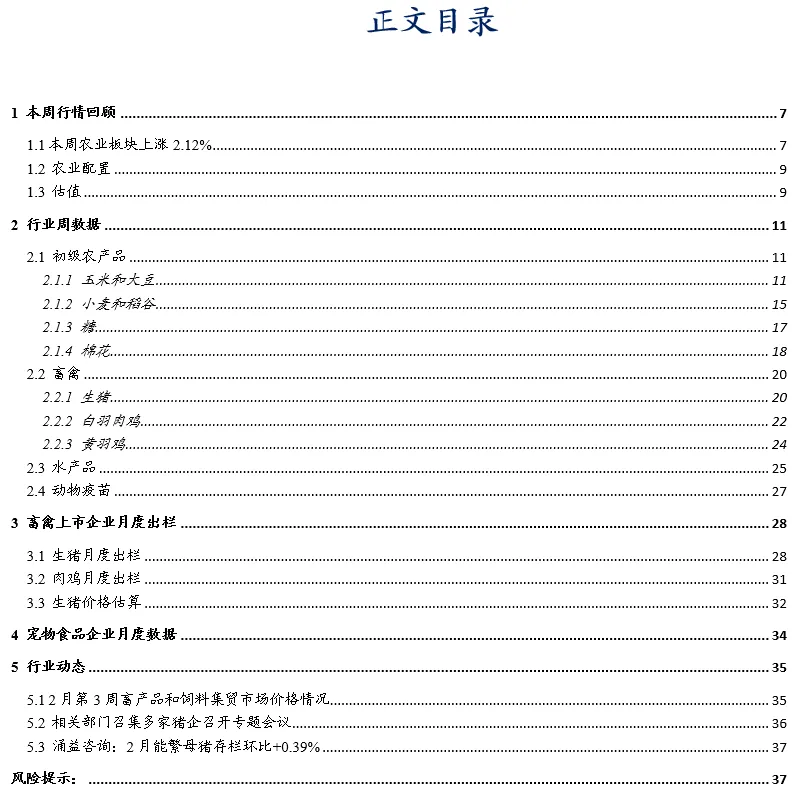 ①生猪价格跌至10.22元/公斤。本周五,全国生猪价格10.22元/公斤,周环比-5.3%。涌益咨询(2.27-3.5):全国90公斤内生猪出栏占比3.96%,周环比-0.12pct;50公斤二元母猪价格1559元/头,周环比持平,同比-4.6%;规模场15公斤仔猪出栏价448元/头,周环比-3.2%,同比-20%;②生猪出栏均重升至128.15公斤。涌益咨询(2.27-3.5):全国出栏生猪均重128.15公斤,周环比+0.42公斤,较2024年、2025年同期分别+5.38公斤、+1.09公斤;150kg以上生猪出栏占比4.37%,周环比+0.1pct,较2024年、2025年同期-0.1pct、+0.14pct;175kg、200kg与标猪价差分别为0.72元/斤、1.19元/斤;2月28日二育平均栏舍利用率22.1%,较节前+2.6pct;③亏损加剧叠加政策调控,生猪行业有望重启去化。i) 从政策层面看,产能调控政策明显趋严。3月3日,发改委联合农业部召集7家生猪养殖企业专题会议,核心聚焦联农助农落地与生猪产能综合调控两大重点,明确提出要提升预警信息准确性,为生猪产业稳定发展筑牢基础。本次会议提出,能繁母猪存栏量或将进一步下调至3650万头左右,建立备案制进一步强化生猪产能调控的精细化程度。我们认为,本次会议进一步压实企业的产能调控责任,生猪产能调控政策明显趋严,2025年12月末全国能繁母猪存栏量3961万头,若产能下调至3650万头,下降幅度将达到7.9%,将为本轮猪价上涨周期奠定坚实基础;ii) 从市场层面看,生猪自繁自养连亏四周,本周五亏损扩大至238元,我们预计,随着政策逐步落实,及行业亏损加剧,生猪养殖行业将迎来再次去产能。截止2025年12月,产能累计去化2%,考虑到去化主要集中在2025Q4,且生产效率提升也会抵消去化部分效果,我们预计2026Q4将迎来真正的猪价上涨周期;④1-2月已公布月报的上市猪企出栏量同比+5.1%。2026年1-2月,10家上市猪企出栏量2,302万头,同比+5.1%,出栏量(万头)从高到低依次为,牧原1161(仅商品猪)、温氏(仅商品猪)566、新希望261、天邦食品116、神农集团52、京基智农46、立华股份37、傲农生物31、东瑞30;出栏量同比增速从高到低依次为,正虹科技76%、东瑞59%、京基智农50%、傲农生物43%、天邦食品23%、立华股份8%、神农集团2%、温氏7%、牧原1%、新希望-1%。⑤估值处历史低位,继续推荐生猪养殖板块。据2025年生猪预测出栏量,牧原股份头均市值2,850元、温氏股份2,018元、新希望2,276元、德康农牧2,283元、天康生物3,116元、立华股份2,289元、天邦831元、正邦3,596元、巨星2,066元、神农4,977元、东瑞2,614元,猪企估值多处于历史低位,我们继续推荐生猪养殖板块,重点推荐牧原股份、立华股份、温氏股份、天康生物。l 白羽父母代存栏低于去年同期,黄羽商品代鸡苗销量近年同期最低①白羽父母代存栏低于2025年同期。本周五,鸡产品价格9,150元/吨,周环比-1%,同比+2%。2026年第8周(2.23-3.1):在产祖代种鸡存栏量133.18万套,周环比-0.4%,处于2019年以来同期高位;在产父母代种鸡存栏量2207.73万套,周环比-0.2%,低于2025年同期水平;父母代鸡苗销量183.17万套,周环比+84.3%,同比+17%;父母代鸡苗价格49.3元/套,周环比+9.4%,同比+10%;②黄羽商品代鸡苗销量2022年以来最低。2026年第8周(2.16-2.22):黄羽在产祖代存栏148.3万套,处于2022年以来同期高位;黄羽在产父母代存栏1299.7万套,处于2022年以来同期低位;黄羽商品代雏鸡销量合计2438.5万羽,处于2022年以来同期最低;黄羽全国商品代毛鸡均价14.85元/公斤,周环比持平,成本13.99元/公斤,毛鸡盈利0.86元/公斤,周环比-0.01元/公斤,黄羽鸡养殖行业已连续盈利7个多月。3月6日,三黄鸡均价16.27元/公斤,周环比-3.3%,同比+0.1%;3月5日,青脚麻鸡均价4.6元/斤,周环比持平,同比+12.2%。l 2026年1月猫狗食品电商销售额同比+19%,品牌表现继续分化2026年1月,猫狗食品电商三平台销售额同比+19%。①上市核心品牌,2026年1月,乖宝旗下品牌麦富迪、弗列加特三平台(天猫、京东、抖音)销售额同比+3.5%、+16.1%;中宠旗下品牌顽皮、领先、Zeal三平台(天猫、京东、抖音)销售额同比+86.4%、+29.2%、+24.4%;佩蒂旗下品牌爵宴三平台(天猫、京东、抖音)销售额同比-27.0%;②主要非上市品牌,皇家三平台(天猫、京东、抖音)销售额同比+48.0%,蓝氏销售额同比+45.2%,网易严选销售额同比+1.9%,诚实一口销售额同比-18.8%,鲜朗销售额同比+53.7%,渴望销售额同比+14.4%,伯纳天纯销售额同比+3.9%,冠能销售额同比+8.3%,凯锐思销售额同比-6.4%,疯狂小狗销售额同比-18.9%,阿飞和巴弟销售额同比-15.7%,比瑞吉销售额同比-4.8%。l 25/26年全球玉米、小麦库消比预测值环比下降,大豆环比上升①25/26全球玉米库消比预测值处环比-0.1pct。USDA2月供需报告预测:25/26年全球玉米库消比19.3%,同比-1.3pct,环比-0.1pct,处15/16年以来最低水平。中国农业农村部市场预警专家委员会月报:2月对中国玉米供需形势预测与1月一致,25/26年结余变化821万吨,较24/25年大幅上升933万吨;②25/26全球小麦库消比预测值环比-0.2pct。USDA22月供需报告预测:25/26年度全球小麦库消比26.5%,同比+1.0pct,环比-0.2pct,处15/16年以来偏低水平;③25/26全球大豆库消比预测值环比+0.1pct。USDA2月供需报告预测:25/26年度全球大豆库消比20.5%,同比-0.2pct,环比+0.1pct。中国农业农村部市场预警专家委员会月报:2月对中国大豆供需形势预测与1月一致,25/26年结余变化241万吨,较24/25年大幅下降897万吨。1 本周行情回顾