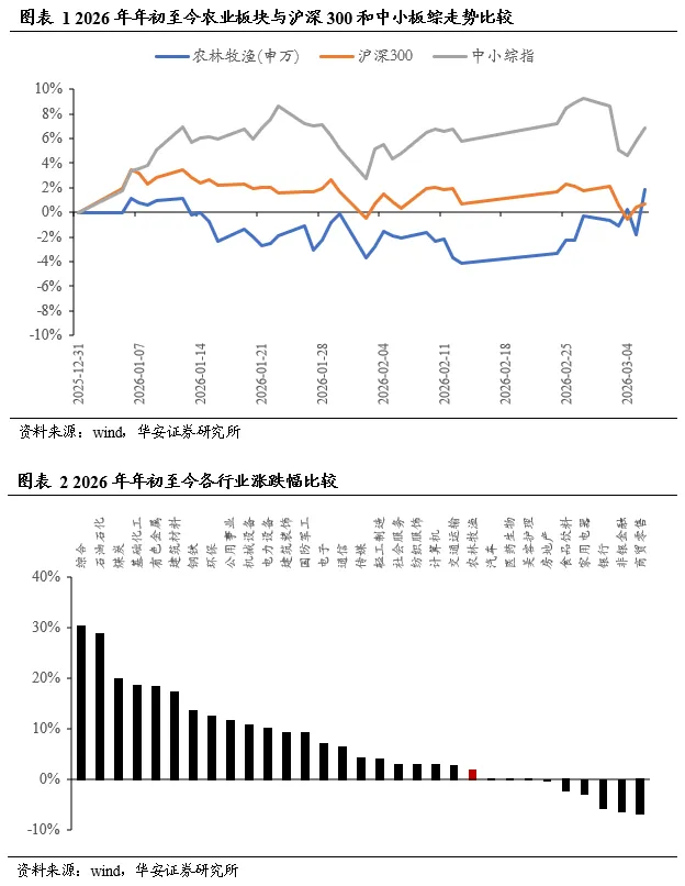 2026年初至今,农林牧渔在申万31个子行业中排名第22位,农林牧渔(申万)指数上涨1.83%,沪深300指数上涨0.66%,中小板综指数上涨6.89%。