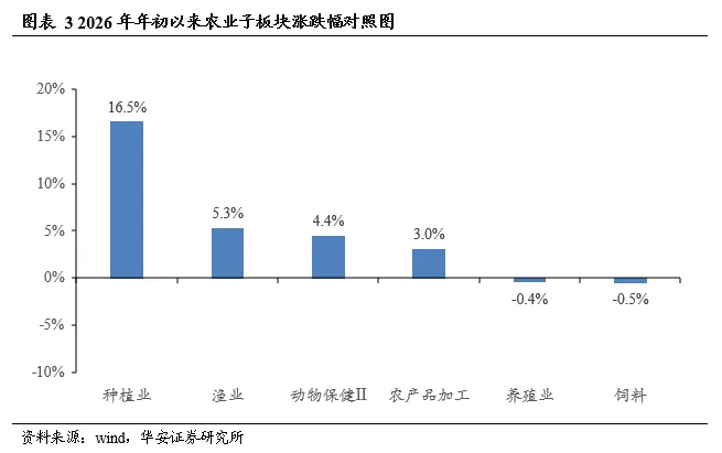 2026年初至今,农业各子板块涨幅从高到低依次为种植业(+16.5%)、渔业(+5.3%)、动物保健Ⅱ(+4.4%)、农产品加工(+3.0%)、养殖业(-0.4%)、饲料(-0.5%)。