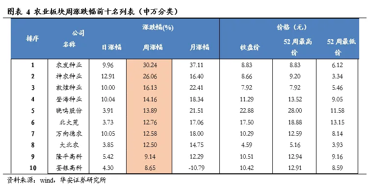 本周(2026年3月2日-2026年3月6日)农林牧渔(申万)指数上涨2.12%,沪深300指数下跌1.07%,中小板综指数下跌2.17%,农业指数跑赢沪深300指数3.19个百分点。