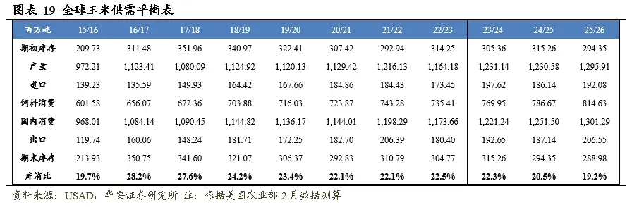 美国农业部2026年2月供需报告预测,2025/26年度(12月至次年11月)全球玉米产量12.96亿吨,国内消费量13.01亿吨,期末库存2.89亿吨,库消比19.2%,预测值较24/25年度下降1.30个百分点。