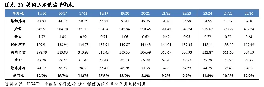 分国别看,2025/26年度美国玉米产量4.32亿吨,国内消费量3.35亿吨,期末库存5,402万吨,库消比12.9%,较24/25年度上升2.66个百分点;2025/26年度中国玉米产量3.01亿吨,国内消费量3.21亿吨,期末库存1.80亿吨,库消比56.1%,较24/25年度下降4.62个百分点。