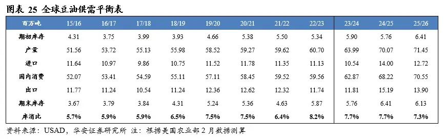 美国农业部2026年2月供需报告预测,2025/26年度全球豆油产量7,145万吨,国内消费量7,055万吨,期末库存613万吨,库消比7.3%,较24/25年度下降0.43个百分点。