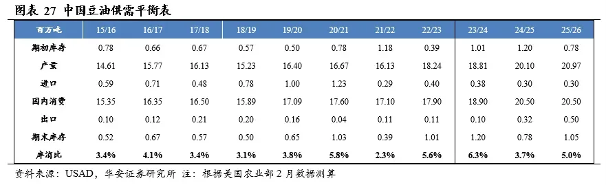 分国别看,2025/26年度美国大豆产量1.16亿吨,国内消费量7,299万吨,期末库存952万吨,库消比8.2%,较24/25年度上升0.87个百分点;2025/26年度中国大豆产量2,090万吨,国内消费量1.33亿吨,期末库存4,439万吨,库消比33.4%,较24/25年度下降1.53个百分点。