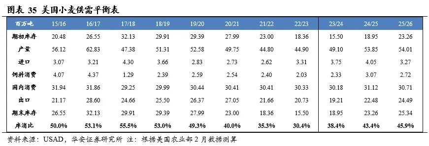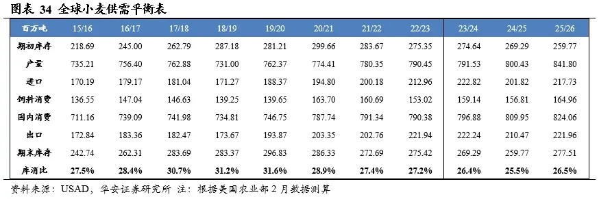 美国农业部2026年2月供需报告预测,2025/26年度全球小麦产量8.42亿吨,国内消费量8.24亿吨,期末库存2.78亿吨,库消比26.5%,较24/25年度上升1.07个百分点。