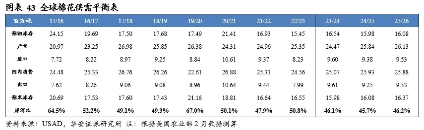 美国农业部2026年2月供需报告预测,2025/26年度全球棉花产量2,613万吨,国内消费量2,588万吨,期末库存1,637万吨,库消比46.2%,较24/25年度上升0.53个百分点。
