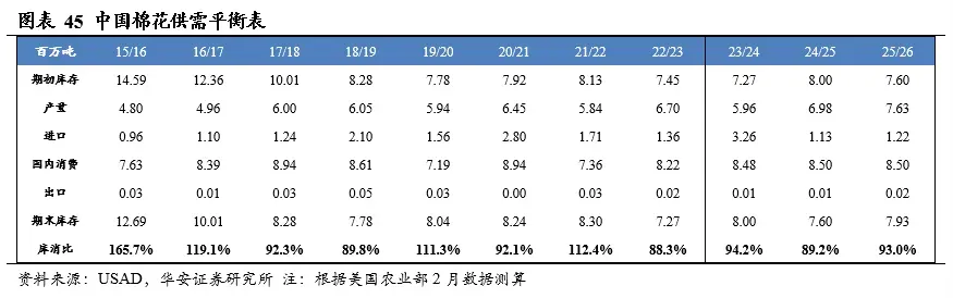 分国别看,2025/26年度美国棉花产量303万吨,国内消费量35万吨,期末库存96万吨,库消比32.4%,较24/25年度上升2.94个百分点;2025/26年度中国棉花产量763万吨,国内消费量850万吨,期末库存793万吨,库消比93.0%,较24/25年度上升3.84个百分点。