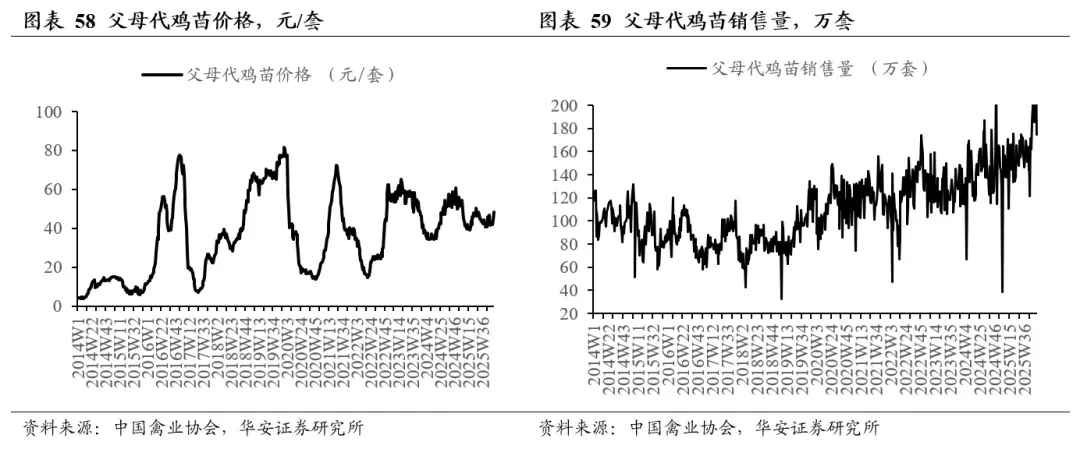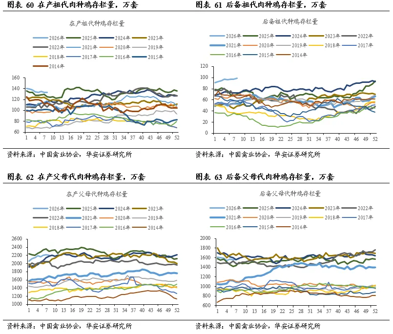 据中国禽业分会披露数据,2026年第8周(2026年2月23日- 2026年3月1日) 父母代鸡苗价格49.30元/套,周环比涨9.38%,同比涨13.81%;父母代鸡苗销量183.17万套,周环比涨84.34%,同比涨28.31%;在产祖代种鸡存栏133.18万套,周环比跌0.35%,同比涨6.49%;后备祖代种鸡存栏99.08万套,周环比涨1.85%,同比涨41.04%;在产父母代种鸡存栏2207.73万套,周环比跌0.24%,同比跌4.16%;后备父母代种鸡存栏1584.78万套,周环比涨1.75%,同比涨5.76%。