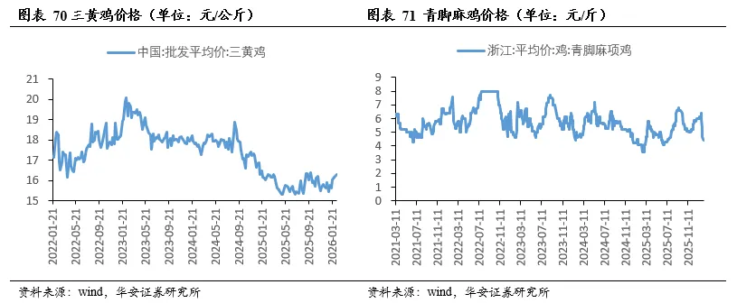 2026年3月6日,三黄鸡均价16.27元/公斤,周环比跌3.27%,同比涨0.12%;2026年3月5日,青脚麻鸡均价4.60元/斤,周环比持平,同比涨12.20%。