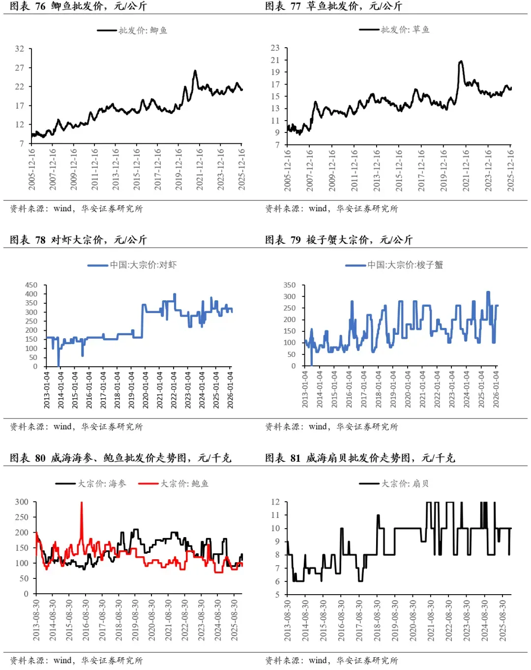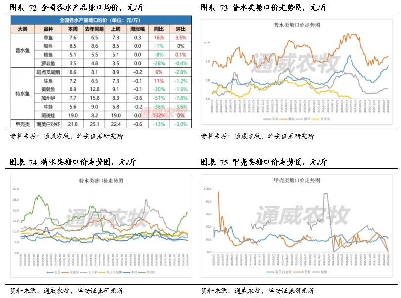 2026年2月27日,鲫鱼批发价21.5元/公斤,周环比跌1.29%,同比涨4.62%;草鱼批发价17.21元/公斤,周环比跌0.06%,同比涨14.58%。