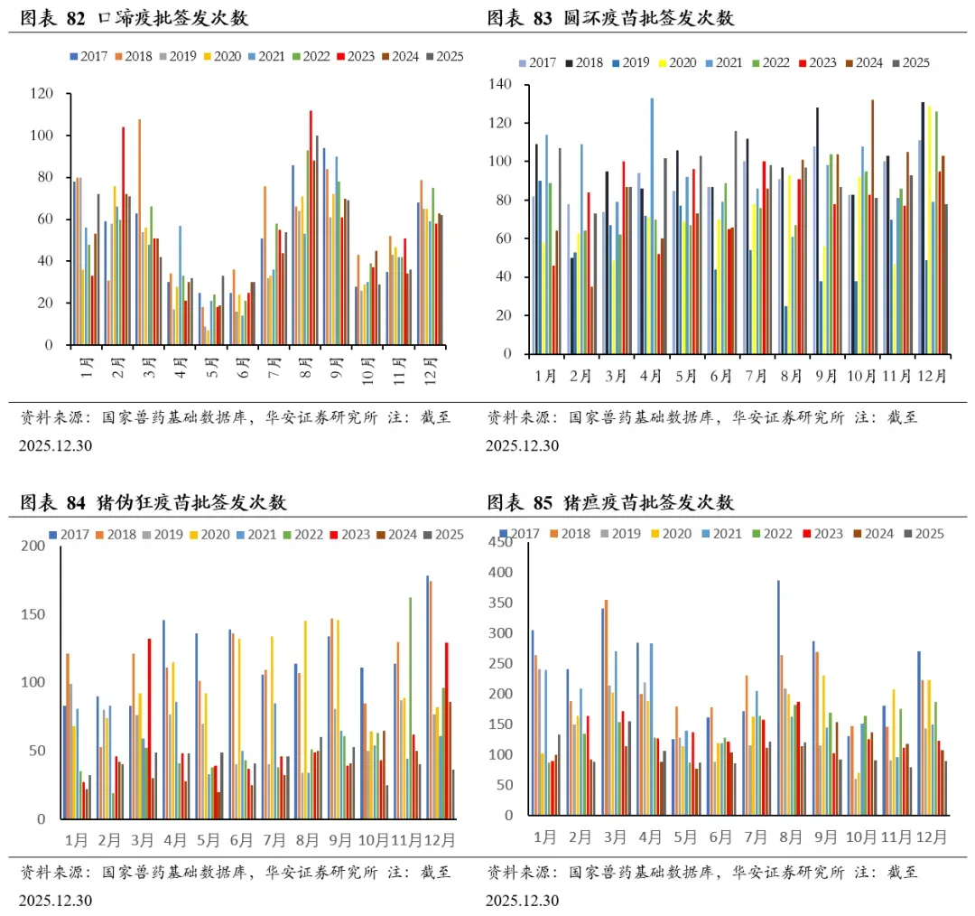 2025年1-12月,猪用疫苗批签发数同比增速由高到低依次为,腹泻苗+16.1%、猪圆环疫苗+10.4%、猪乙型脑炎疫苗+9.0%、猪伪狂犬疫苗+5.7%、口蹄疫苗+5.2%、猪瘟疫苗-4.8%、猪细小病毒疫苗-13.2%、高致病性猪蓝耳疫苗-18.7%。