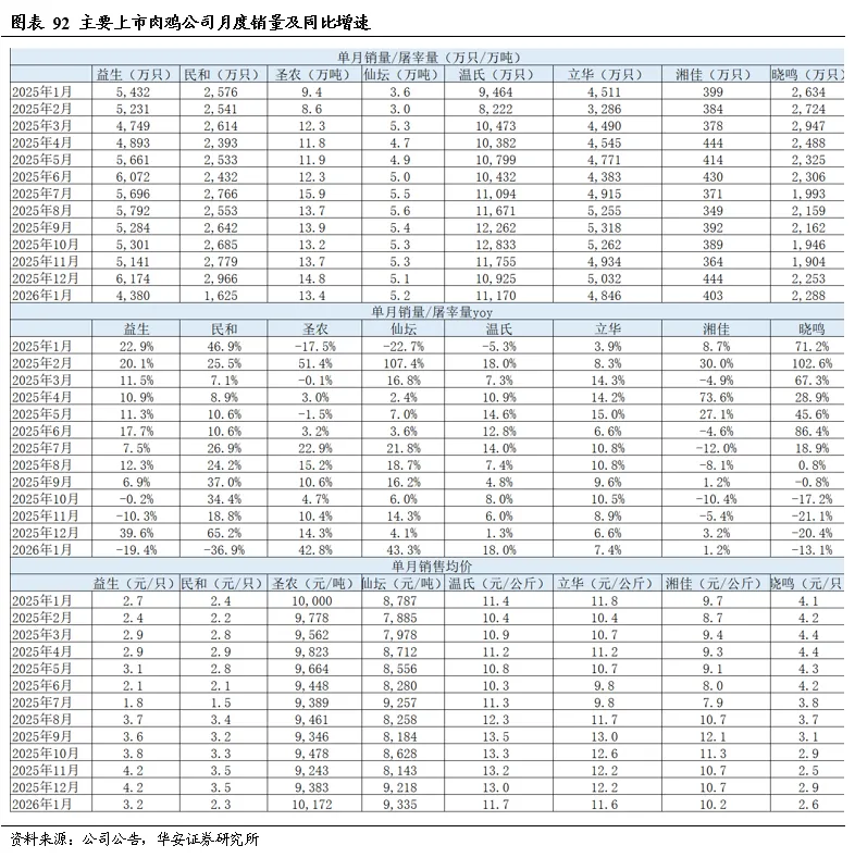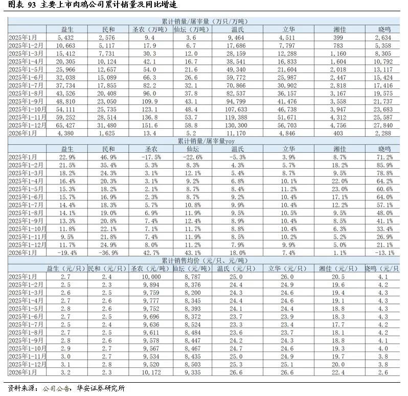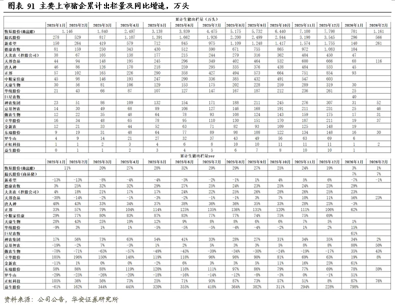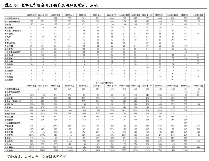 2026年1-2月,10家上市猪企出栏量2,302万头,同比+5.1%,出栏量(万头)从高到低依次为,牧原1161(仅商品猪)、温氏(仅商品猪)566、新希望261、天邦食品116、神农集团52、京基智农46、立华股份37、傲农生物31、东瑞30;出栏量同比增速从高到低依次为,正虹科技76%、东瑞59%、京基智农50%、傲农生物43%、天邦食品23%、立华股份8%、温氏7%、神农集团2%、牧原1%、新希望-1%。