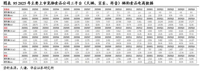 2023-2025年,猫狗食品三平台(天猫、京东、抖音)销售额分别为246亿元、278亿元、306亿元,同比分别+17.0%、+13.2%、+10.1%。2025Q1-Q4,猫狗食品三平台销售额同比+18.5%、+9.5%、+5.5%、8.8%。2026年1月,猫狗食品三平台销售额同比增长19%。