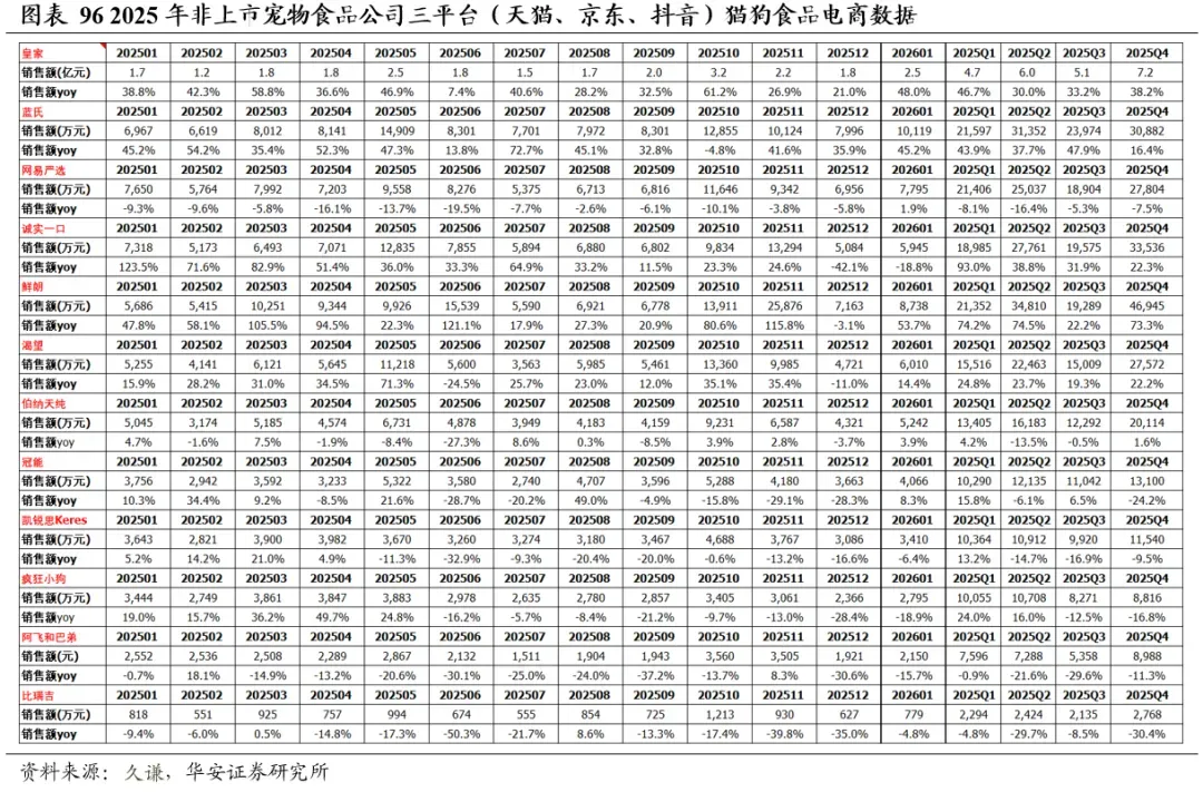 2025年,皇家、蓝氏、诚实一口、鲜朗、渴望销售额同比+36.4%、+33.9%、+38.5%、+63%、+22.5%。2025年,皇家三平台(天猫、京东、抖音)销售额23.0亿元,同比+36.4%,蓝氏销售额10.8亿元,同比+33.9%,网易严选销售额9.3亿元,同比-9.7%,诚实一口销售额10.0亿元,同比+38.5%,鲜朗销售额12.2亿元,同比+63.0%,渴望销售额8.1亿元,同比+22.5%,伯纳天纯销售额6.2亿元,同比-2.7%,冠能销售额4.7亿元,同比-5.8%,凯锐思销售额4.3亿元,同比-8.4%,疯狂小狗销售额3.8亿元,同比+1.2%,阿飞和巴弟销售额2.9亿元,同比-15.8%,比瑞吉销售额1.0亿元,同比-20.9%。