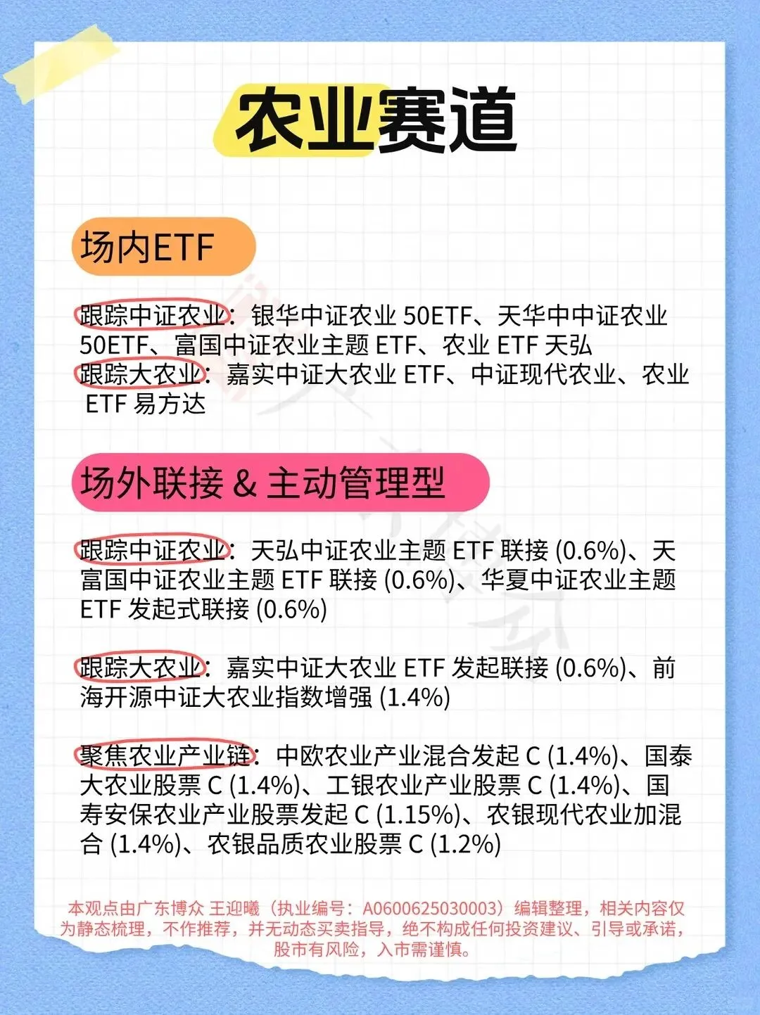 跟踪大农业:嘉实中证大农业 ETF 发起联接 (0.6%)、前海开源中证大农业指数增强 (1.4%)